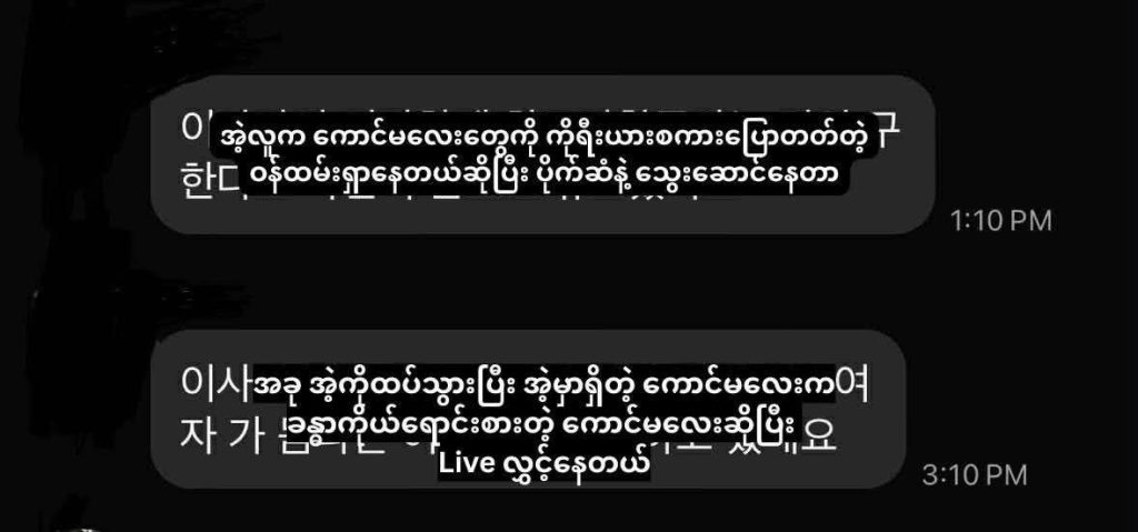 အဆိုပါ ကိုရီးယား You Tuberက မြန်မာမိန်းကလေးတွေကို တရားဝင်ခွင့်ပြုချက်မတောင်းပဲ ခိုးယူရိုက်ထားတဲ့ပုံတွေကိုလည်း သူ့ရဲ့ YouTube channel မှာ တင်ကာ ပုံပါအမျိုးသမီးနဲ့ လက်ထပ်ချင်လို့ ဖြစ်စေ၊ အတူနေချင်လို့ ဖြစ်စေ နှုန်းထားဘယ်လောက်လို့ သတ်မှတ်ကာ membership channel မှာ အခကြေးငွေနဲ့ ရောင်းစားနေကြောင်းကိုလည်း STOP Sexual Abuse to the children page က သက်သေနဲ့တကွသိရှိထားတယ်လို့ဆိုပါတယ်။
