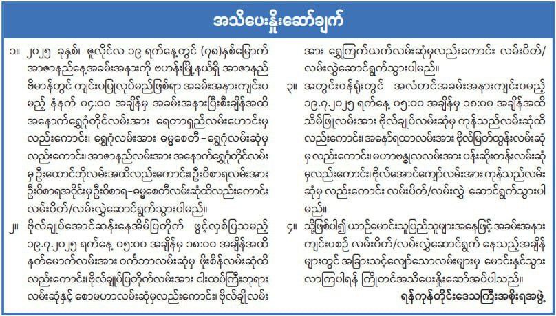 ◾ အာဇာနည်နေ့ အခမ်းအနားပြုလုပ်မည့် အာဇာနည်ဗိမာန်၊ အတွင်းဝန်ရုံး၊ ဗိုလ်ချုပ်ပြတိုက်များရှိရာနေရာများတွင် လမ်းပိတ်/လမ်းလွှဲ ဆောက်ရွက်ထားမည့် အခြေအနေများအား ရန်ကုန်တိုင်းအစိုးရ အသိပေးကြေညာ