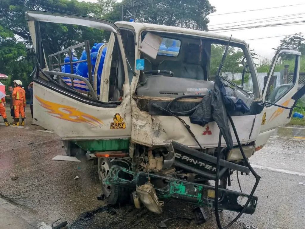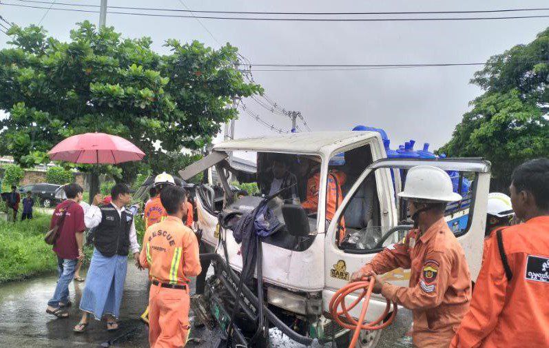 ယာဥ်တိုက်မှုကြောင့် ကားခေါင်းခန်းတွင် ညပ်နေသာ ရေသန့်တင်ကားမောင်းသူ အမျိုးသားကို မီးသတ်တပ်ဖွဲ့ဝင်များက ၆ မိနစ်ကြာ ကယ်ထုတ်ခဲ့ရကြောင်း သိရသည်။