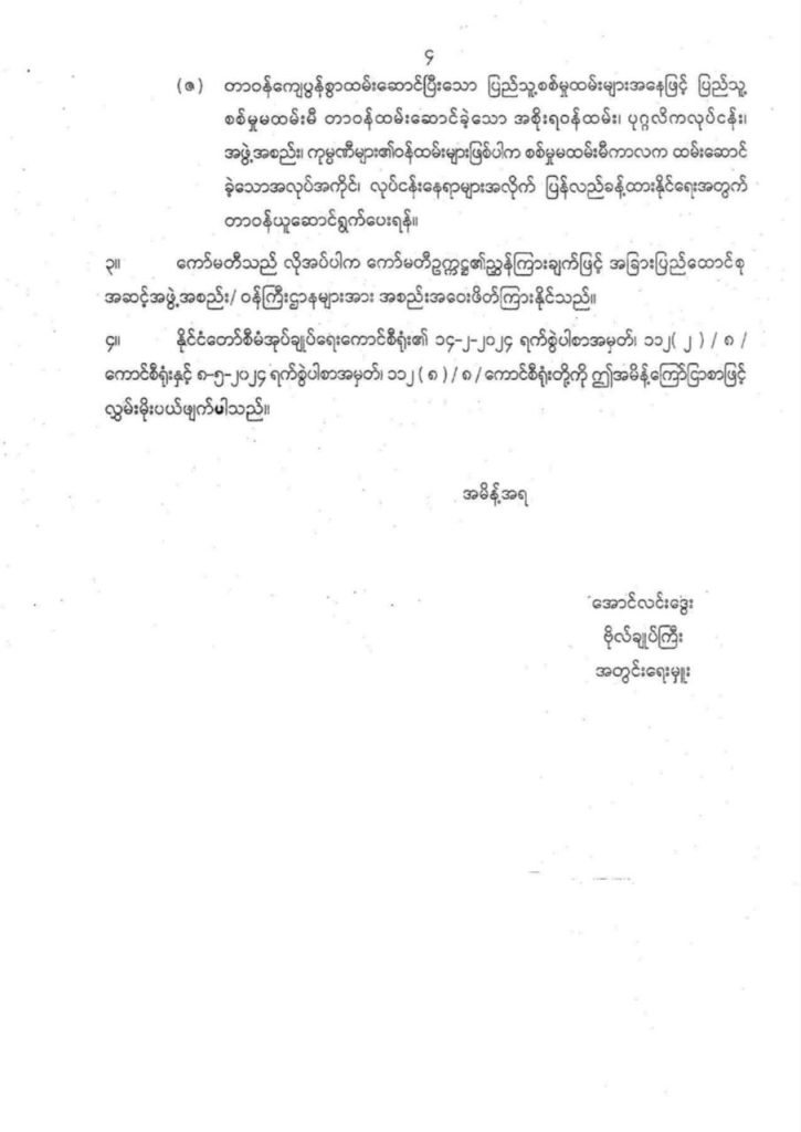 ကော်မတီသည် လိုအပ်ပါက ကော်မတီဥက္ကဋ္ဌ၏ ညွှန်ကြားချက်ဖြင့် အခြားပြည်ထောင်စု အဆင့်အဖွဲ့အစည်း/ဝန်ကြီးဌာနများအား အစည်းအဝေးဖိတ်ကြားနိုင်ကြောင်း၊ နိုင်ငံတော်စီမံအုပ်ချုပ်ရေးကောင်စီရုံး၏ (၁၄-၂-၂၁၂၄) ရက်စွဲပါစာအမှတ်၊ ၁၁၂( ၂ ) / ၈ /ကောင်စီရုံးနှင့် (၈-၅-၂၀၂၄) ရက်စွဲပါစာအမှတ်၊ ၁၁၂ ( ၈ ) / ၈ / ကောင်စီရုံးတို့ကို ဤအမိန့်ကြော်ငြာစာဖြင့် လွှမ်းမိုးပယ်ဖျက်လိုက်ကြောင်း ဖော်ပြထားသည်။