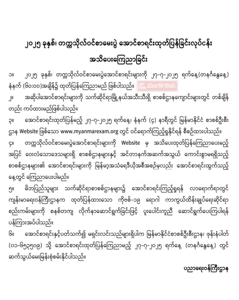 အောင်စာရင်းထုတ်ပြန်မည့် ဇူလိုင် ၂၇ ရက်နေ့၊ နံနက် (၄) နာရီတွင် မြန်မာနိုင်ငံ စာစစ်ဦးစီးဌာန Website ဖြစ်သော www.myanmarexam.org တွင် ဝင်ရောက်ကြည့်ရှုနိုင်ရန် စီစဉ်ထားမည့် အပြင် ဝေးလံသောဒေသများရှိ စာစစ်ဌာနများနှင့် အင်တာနက်အဆက်အသွယ် ကောင်းစွာမရရှိသည့် စာစစ်ဌာနများ၏ အောင်စာရင်းများကို မြန်မာ့အသံရေဒီယိုအစီအစဉ်မှလည်း အောင်စာရင်းထွက်သည့် နေ့တွင် ကြေညာပေးမည်ဖြစ်သည်။