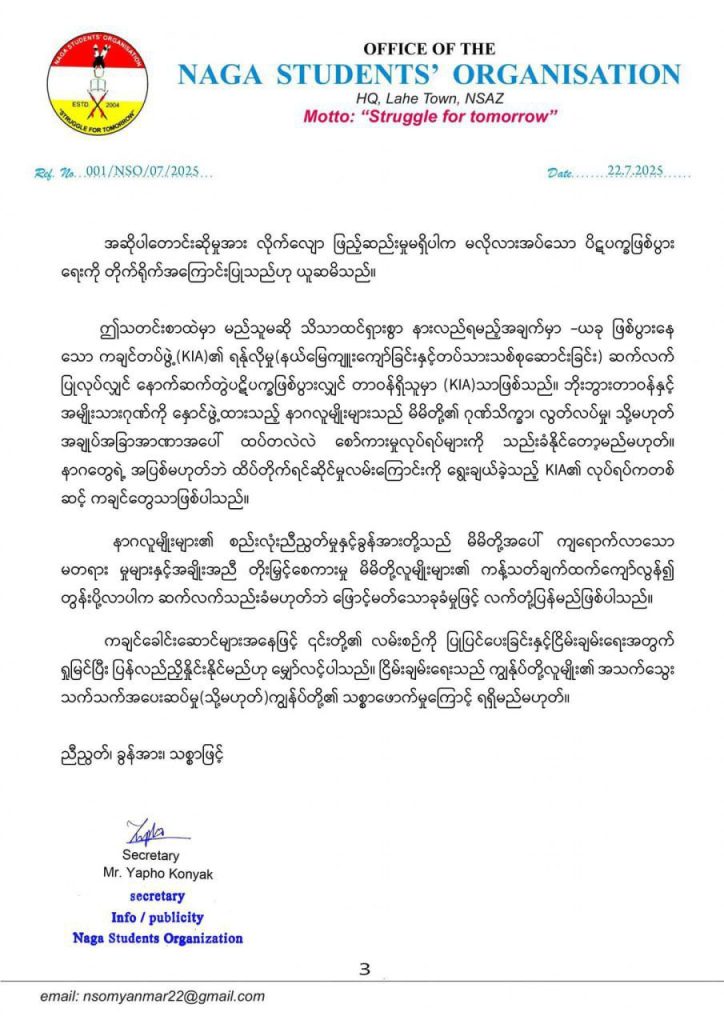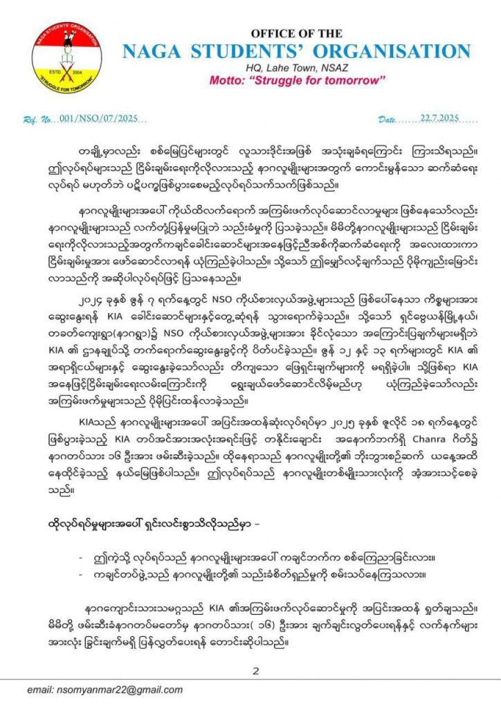 ဇူလိုင် ၂၂ ရက် ရက်စွဲဖြင့် ထုတ်ပြန်သော NSO ၏ ထုတ်ပြန်ချက်အရ NSO သည် နာဂလူမျိုးများကို ကိုယ်စားပြု၍ ကချင်လွတ်မြောက်ရေး တပ်မတော်(KIA)မှ နာဂလူမျိုးများအပေါ် ရန်လိုမှု၊ နယ်မြေကျူးကျော်ခြင်းနှင့် တပ်သားသစ်စုဆောင်းခြင်း ဆက်တိုက်ပြုလုပ်နေသော လုပ်ဆောင်ချက်အပေါ် အပြင်းအထန်ရှုတ်ချသည်ဟုလည်း ထုတ်ပြန်ချက်ကဆိုသည်။