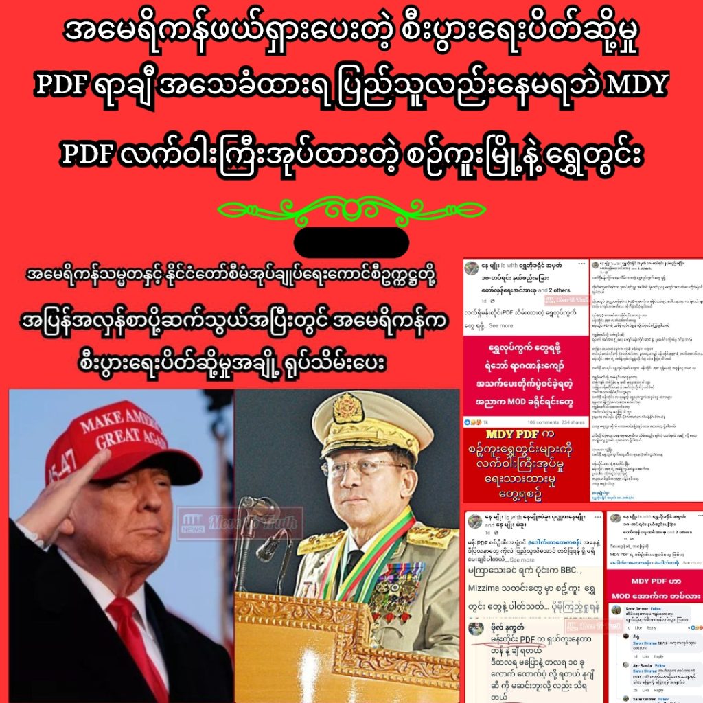 MDY PDF တွေဟာ သယံဇာတနယ်မြေတွေကို လက်ဝါးကြီးအုပ်နိုင်ဖို့ စဉ့်ကူးကို လက်ဦးမှုယူသိမ်းခဲ့တဲ့အပြင် မတ္တရာမြို့နယ်က ရွှေလုပ်ကွက်တွေကိုလည်းထိန်းချုပ်နိုင်ခဲ့တာပါ။ ဒီလို ရွှေလုပ်ကွက်တွေကို လက်နက်ကိုင်တွေ လက်ဝါးကြီး သိမ်းနိုင်ခဲ့ချိန်မှာ သတိရစရာကောင်းတာက NLD, CRPH,NUG,PDF နဲ့ EAOs တွေကို ထောက်ခံခဲ့ကြတဲ့ လူတွေရဲ့စကားကိုပါ။ နိုင်ငံရေး၊ စစ်ရေးကို နားလည်ကြတဲ့လူတွေက NLD, CRPH,NUG,PDF နဲ့ EAOs တွေဟာ တစ်ချိန်ကြရင် လက်နက်အားကိုးနဲ့ လူသတ်ဓားပြတိုက် ဆက်ကြေးကောက်ဖြစ်လာမှာ တိုက်ပွဲတွေဖြစ်လာရင် မြို့တွေပျက်မှာလို့ ပြောခဲ့ချိန်မှာ “NLD, CRPH,NUG,PDF နဲ့ EAOs တွေကို ထောက်ခံသူတွေက မြေကျန်ရင်ရပြီ”လို့ ပြောခဲ့ကြတာပါ။ တကယ့်တကယ် သူတို့နေတဲ့မြို့တွေကို NLD, CRPH,NUG,PDF နဲ့ EAOs တွေ ထိန်းချုပ်သွားချိန်မှာ ဒေသခံပြည်သူတွေအဖို့ မြေတောင်မကျန်တော့ဘဲ ကိုယ့်အိမ်ကို အသိမ်းခံရ၊ ကိုယ်မြေကွက်ကို ရွှေတူး၊ သယံဇာတတူးဖို့ လက်ဝါးကြီးအုပ်နှင်ထုတ်ခံရတာတွေကို စဉ့်ကူး၊ ဖားကန့်၊ မိုးကုတ် စတဲ့ အသိမ်းခံမြေတွေ မြို့တွေ အများအပြားမှာ ရင်ဆိုင်လိုက်ရတာပါ။ လက်နက်အားကိုး ကိုယ်ကျိုးစီးပွားရှာကြတယ်ဆိုရာမှာ ဘယ်လို စစ်စည်းမျဥ်းစည်းကမ်း၊ စစ်ဥပဒေကိုမှ လိုက်နာစရာမလိုဘဲ ထင်တိုင်းကြဲတဲ့ NLD, CRPH,NUG,PDF နဲ့ EAOs တွေကို ထောက်ခံမိတဲ့သူတွေဟာ မြေတောင်မကျန်တော့ဘဲ ငါးပါးမှောက်မှ ကျောချမှ ဓားပြမှန်းသိချိန်မှ အနှစ်နှစ်အလလတည် ဆောက်ခဲ့ရတဲ့ဘဝတွေ အသက်တွေကတော့ ပျက်သုဥ်းကုန်ကြတော့တာပါပဲ။ နောင်မှရတဲ့နောင်တဟာ အချိန်မမီတော့ဘူးဆိုပေမဲ့ လက်ကျန်ဘဝဟာ လမ်းဘေးနေလို့မဖြစ်ဘဲ ပြန်တည်ဆောက်ရမှာဖြစ်လို့ ဒီလိုပြန်တည်ဆောက်ချင်သူတွေအဖို့တော့ တပ်မတော်ပြန်ထိန်းသိမ်းလို့ အေးအေးချမ်းချမ်းနေခွင့်ပြန်ရသွားတဲ့ လွိုင်ကော်၊ နောင်ချို၊ လားရှိုး၊ မိုးဗြဲ၊ သပိတ်ကျင်းစတဲ့မြို့တွေက အားကျစရာပါပဲ။ ဒီမြို့က လူတွေဟာ အကြမ်းဖက်လက်ထဲ ဆုံးခန်းတိုင်သွားပြီထင်တဲ့ ကိုယ့်အိမ်ကိုယ့်ခြံကိုယ့်စီးပွားကို တပ်မတော်ဆီကနေ ပြန်ရခဲ့တာမို့ ဒီလိုမျိုး ကိုယ့်ဘဝကိုယ် ကိုယ့်မြို့မှာ ပြန်တည်ဆောက်ခွင့်ဟာ လူထုအပေါ်မှာပဲ မူတည်ပြီး မြေတောင်မကျန်အောင်သိမ်းတဲ့ NLD, CRPH,NUG,PDF နဲ့ EAOs တွေလက်ထဲ ကိုယ့်ဘဝနဲ့ အသက်အိုးအိမ်စည်းစိမ်ပျက်သုဥ်းခံမလား။ ကိုယ့်မြို့ကိုယ် တပ်မတော်နဲ့အတူ ပြန်ယူပြီး ကိုယ့်ဘဝ၊ ကိုယ့်စီးပွားကို ပြန်ထူထောင်မလားဆိုတာကိုတော့ ကျောချထားတဲ့ ဓားရာတွေကြည့်ပြီးဆုံးဖြတ်နိုင်ပါစေလို့ ဆုတောင်းရင်းနဲ့ ဖွတ်ထွက်တာတောင် တောင်ပို့မှန်းမသိသေးရင် အလွဲနင့်ပြင်မရှိတော့ဘူးလို့သာ ကိုယ့်ကိုယ်ကိုယ်ပြောပြီး အသက်ဘဝနဲ့ စီးပွားကို အမျှဝေဖို့သာလုပ်ထားကြပါလို့ သတိပေးရင်း ဒီတစ်ပတ်ရဲ့ စီးပွားရေးသုံး