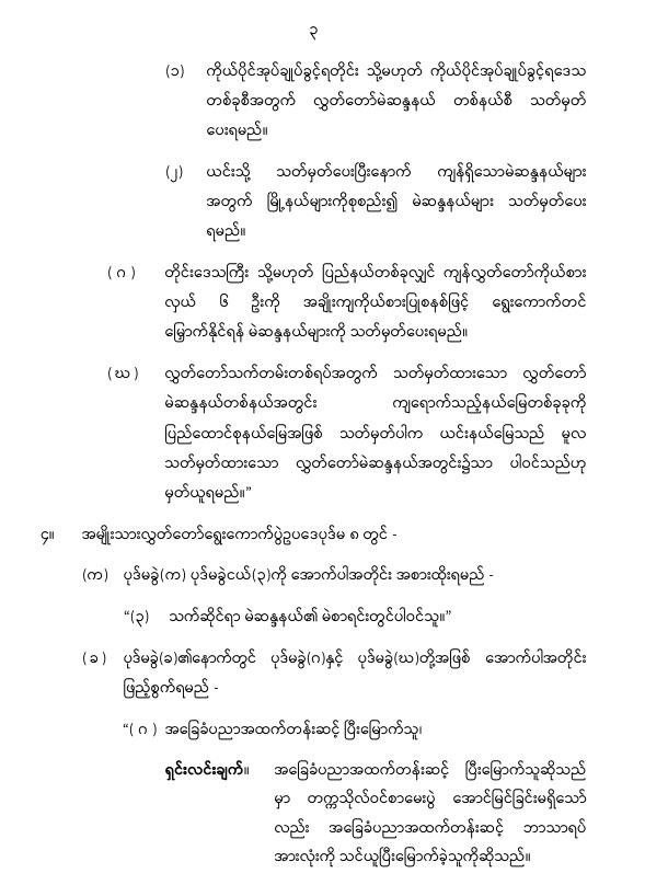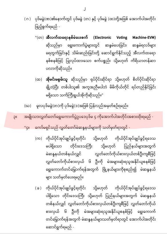 အမျိုးသားလွှတ်တော်ရွေးကောက်ပွဲဥပဒေကို ဆဋ္ဌမအကြိမ်ပြင်ဆင်သည့် ဥပဒေကို နိုင်ငံတော်စီမံအုပ်ချုပ်ရေးကောင်စီ ဥပဒေအမှတ် (၄၆/၂၀၂၅) ဖြင့် ဇူလိုင် ၂၉ ရက်(ယမန်နေ့) က ပြဋ္ဌာန်းလိုက်ပြီး အဆိုပါ ဥပဒေတွင် အမျိုးသားလွှတ်တော်ရွေးကောက်ပွဲဥပဒေပုဒ်မ ၄ အား အစားထိုးပြင်ဆင်သတ်မှတ်ထားသည်။