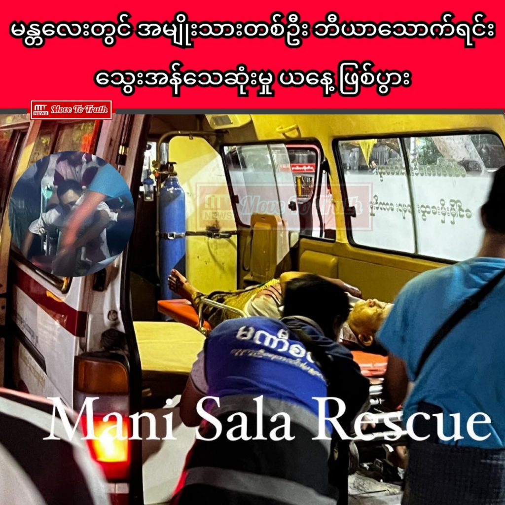 ယနေ့ညပိုင်း ၈ နာရီကျော်အချိန်ကက မန္တလေးမြို့၊ ချမ်းအေးသာစံမြို့နယ်အတွင်းရှိ ဘီယာဆိုင်တစ်ခုတွင် အသက် (၅၅)နှစ်အရွယ်အမျိုးသားတစ်ဦး ဘီယာသောက်ရင်း သွေးအန်သေဆုံးမှုဖြစ်ပွားကြောင်း သတင်း အရ “မဏီစလ” လူမှုကူညီရေးအသင်း(မန္တလေး) က အရေးပေါ် ထွက်ခွာကူညီခဲ့ကြောင်း သိရသည်။
