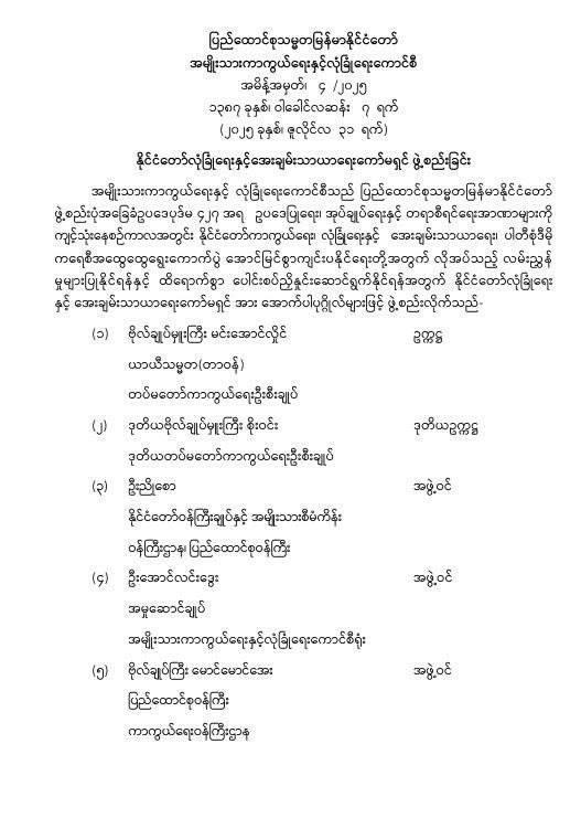 နိုင်ငံတော်လုံခြုံရေးနှင့် အေးချမ်းသာယာရေးကော်မရှင်တွင် ဥက္ကဋ္ဌအဖြစ် ယာယီသမ္မတ (တာဝန်)၊ တပ်မတော်ကာကွယ်ရေးဦးစီးချုပ် ဗိုလ်ချုပ်မှူးကြီးမင်းအောင်လှိုင်က ဦးဆောင်ပြီး ဒုတိယတပ်မတော်ကာကွယ်ရေးဦးစီးချုပ် ဒုတိယဗိုလ်ချုပ်မှူးကြီး စိုးဝင်းက ဒုတိယဥက္ကဋ္ဌအဖြစ်တာဝန်ယူထားကာ ဦးညိုစော၊ ဦးအောင်လင်းဒွေး၊ ဗိုလ်ချုပ်ကြီးမောင်မောင်အေး၊ ဒုတိယဗိုလ်ချုပ်ကြီးထွန်းထွန်းနောင်၊ ဦးသန်းဆွေ၊ ဒုတိယဗိုလ်ချုပ်ကြီးရာပြည့်၊ ဗိုလ်ချုပ်ကြီးကျော်စွာလင်းနှင့် ဗိုလ်ချုပ်ကြီးရဲဝင်းဦးတို့ ပါဝင်ဖွဲ့စဥ်းထားကြောင်း သိရသည်။
