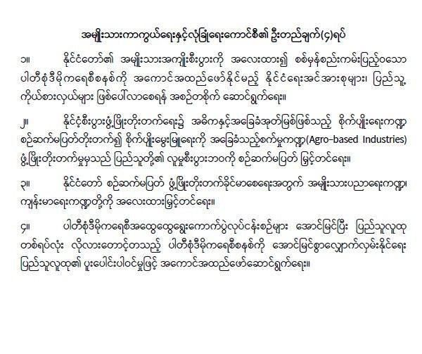 နံပါတ် (၂) မှာ နိုင်ငံ့စီးပွားဖွံဖြိုးတိုးတက်ရေး၌ အဓိကနှင့်အခြေခံအုတ်မြစ်ဖြစ်သည့် စိုက်ပျိုးရေးကဏ္ဍ စဉ်ဆက်မပြတ်တိုးတက်၍ စိုက်ပျိုးမွေးမြူရေးကို အခြေခံသည့်စက်မှုကဏ္ဍ (Agro-based Industries) ဖွံ့ဖြိုးတိုးတက်မှုမှသည် ပြည်သူတို့၏ လူမှုစီးပွားဘဝကို စဉ်ဆက်မပြတ် မြှင့်တင်ရေးဖြစ်သည်။