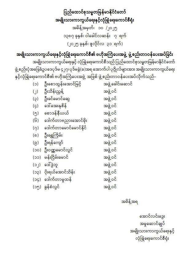 အဖွဲ့ဝင်များအဖြစ် ဦးသိန်းညွန့်၊ ဦးခင်မောင်ဆွေ၊ ဒေါ်အေးနုစိန်၊ စောဒန်နီယယ်၊ ဒေါက်တာဗညားအောင်မိုး၊ ဒေါက်တာမောင်မောင်နိုင်၊ ဦးရွှေကြိမ်း၊ ဦးရန်ကျော်၊ ဦးဝဏ္ဏမောင်လွင်၊ မန်းငြိမ်းမောင်၊ ဒေါ်ဒွဲဘူ၊ ပိုးရယ်အောင်သိန်း၊ ဒေါက်တာမှုထန်နှင့် ခွန်စံလွင်တို့ဖြင့် ဖွဲ့စည်းတာဝန်ပေးအပ်ခဲ့ကြောင်း သိရသည်။