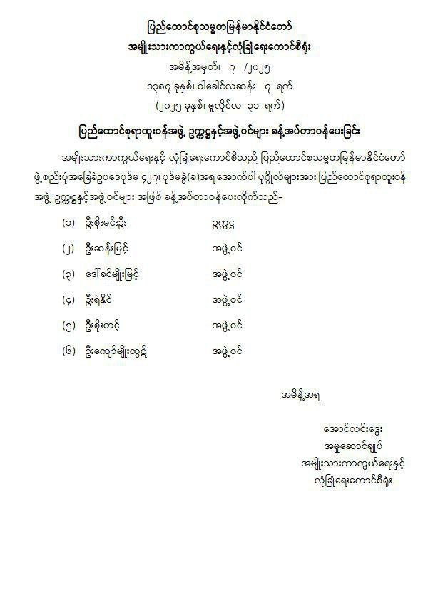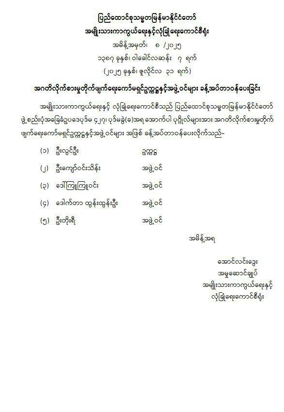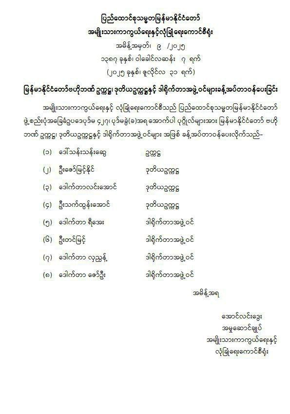 ပြည်ထောင်စုရာထူးဝန်အဖွဲ့ ဥက္ကဋ္ဌနှင့်အဖွဲဝင်များ၊ အဂတိလိုက်စားမှုတိုက်ဖျက်ရေး ကော်မရှင်ဥက္ကဋ္ဌနှင့်အဖွဲဝင်များနှင့် ဗဟိုဘဏ် ဥက္ကဋ္ဌ၊ ဒုတိယဥက္ကဋ္ဌနှင့် ဒါရိုက်တာအဖွဲ့ဝင်များ ခန့်အပ်တာဝန်မှုများအား အမျိုးသားကာကွယ်ရေးနှင့်လုံခြုံရေးကောင်စီမှ ယနေ့တွင် ထုတ်ပြန်ထားသည်။