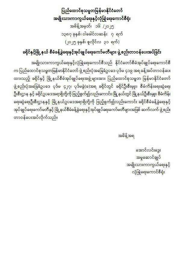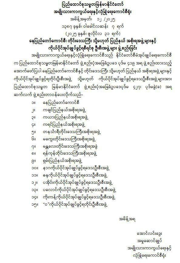 အလားတူ ပြည်ထောင်စုသမ္မတမြန်မာနိုင်ငံတော် မျိူးသားကာကွယ်ရေးနှင့်လုံခြုံရေးကောင်စီရုံး အမိန့်အမှတ် (၁၆ /၂၀၂၅)ဖြင့် ခရိုင်နှင့်မြို့နယ်စီမံခန့်ခွဲရေးနှင့်အုပ်ချုပ်ရေးကော်မတီများ ဖွဲ့စည်းတာဝန်ပေးအပ်ခြင်းအား ဖွဲ့စည်းပုံအခြေခံဥပဒေ ပုဒ်မ ၄၁၉ အရ ခန့်အပ်တာဝန်ပေးထားသည့် ခရိုင်နှင့် မြို့နယ်စီမံအုပ်ချုပ်ရေးအဖွဲ့များအား ပြည်ထောင်စုသမ္မတ မြန်မာနိုင်ငံတော် ဖွဲ့စည်းပုံအခြေခံဥပဒေ ပုဒ်မ ၄၂၇၊ ပုဒ်မခွဲ(ခ)အရ ခရိုင်တွင် ခရိုင်ဦးစီးမှူး၊ စီမံကိန်းရေးဆွဲရေးဦးစီးဌာန နှင့် ခရိုင်ဥပဒေအရာရှိတို့ကို ဖြည့်စွက်၍လည်းကောင်း၊ မြို့ နယ်တွင် မြို့နယ်ဦးစီးမှူး၊ စီမံကိန်း ရေးဆွဲရေးဦးစီးဌာနနှင့် မြို့နယ်ဥပဒေအရာရှိတို့ကို ဖြည့်စွက်၍လည်းကောင်း ခရိုင်စီမံခန့်ခွဲရေးနှင့် အုပ်ချုပ်ရေးကော်မတီနှင့် မြို့နယ်စီမံခန့်ခွဲရေးနှင့် အုပ်ချုပ်ရေးကော်မတီများအဖြစ် ဆက်လက်ဖွဲ့စည်း တာဝန်ပေးအပ်ခဲ့သည်။