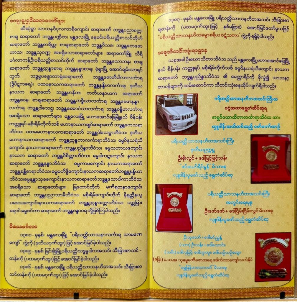 ထို့ ဂုဏ်ပြုပူဇော်ပွဲတွင် အရှင်ဃောသိတာလင်္ကာရာဘိဝံသအား ပရိယတ္တိသာသနဟိတအသင်းကြီးက Kluger ယာဉ်တစ်စီး ဆက်ကပ်မည်ဖြစ်ကာ အသင်းကြီး၏ ဒုတိယဥက္ကဋ္ဌ ဦးစိုးလွင်မိသားစု၊ အတွင်းရေးမှူး ဦးဇော်ဇော်မိသားစုနှင့် ရွှေမြန်မာထောပတ်မိသားစုတို့က ရွှေတံဆိပ်များ ဆက်ကပ်ပူဇော်သွားမည်ဖြစ်ကြောင်း သိရသည်။