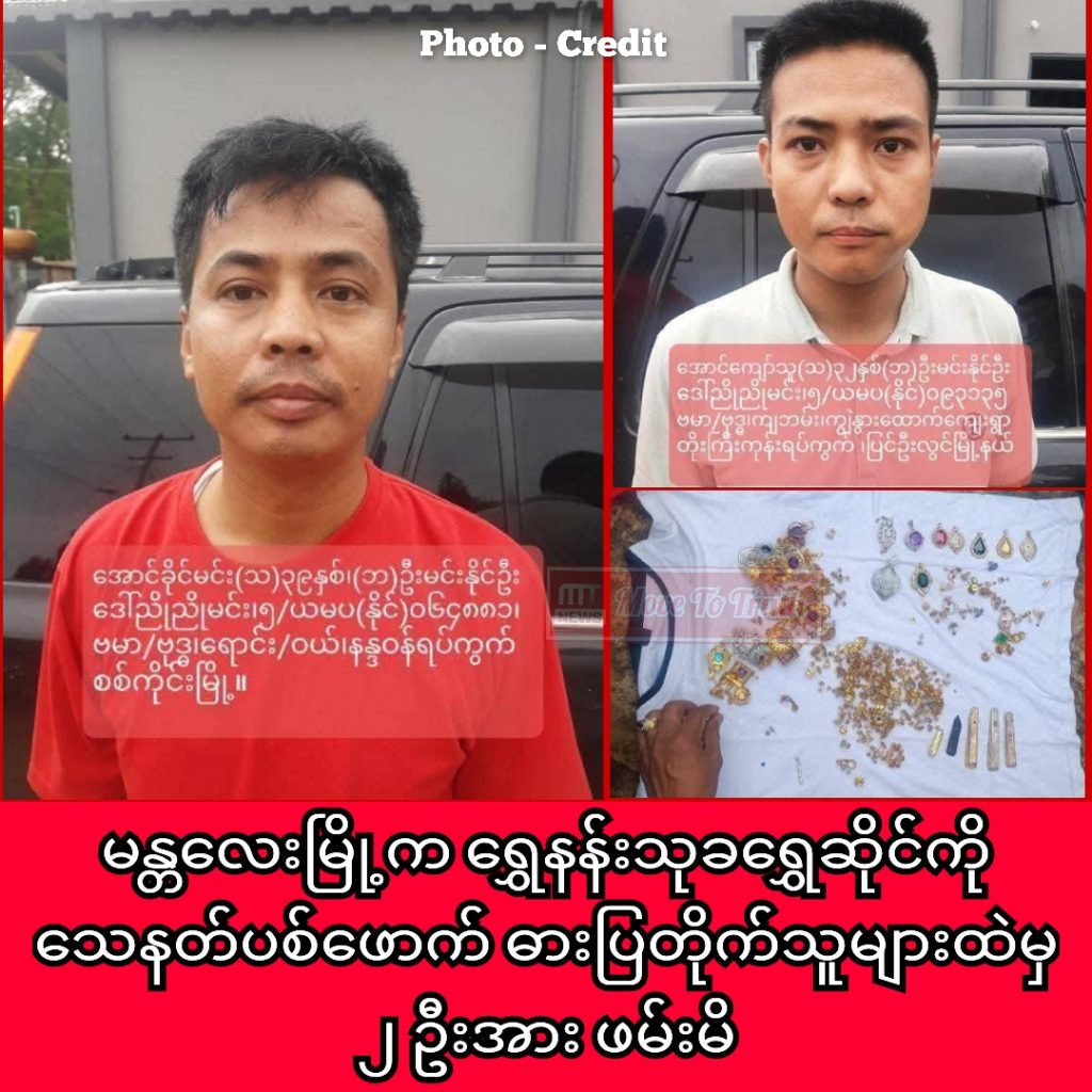 မန္တလေးမြို့က ရွှေနန်းသုခရွှေဆိုင်ကို သေနတ်ပစ်ဖောက် ဓားပြတိုက်သူများထဲမှ ၂ ဦး ဖမ်းမိထားပြီ ဖြစ်ကြောင်း အုပ်ချုပ်ရေးအဖွဲ့နှင့်နီးစပ်သူက MT News ကို ပြောသည်။