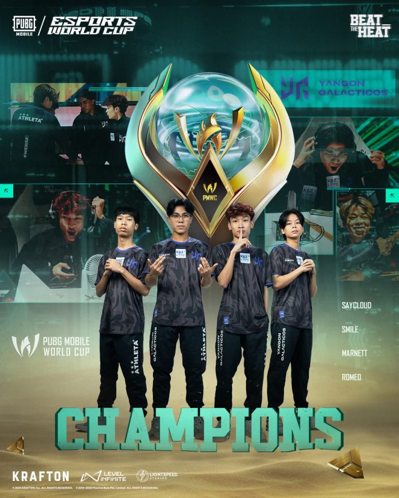 “𝐖𝐞 𝐎𝐰𝐧 𝐭𝐡𝐞 𝐖𝐨𝐫𝐥𝐝 🏆 မြန်မာနိုင်ငံနဲ့ မိုင်ပေါင်း (၄,၀၀၀) ကျော်အကွာအဝေး၊ ဆော်ဒီနိုင်ငံ Riyadh မြို့မှာကျင်းပတဲ့ PMWC 2025 ပြိုင်ပွဲမှာတော့ ကျွန်တော်တို့ YG PUBGM အသင်းအနေနဲ့ ကမ္ဘာ့စင်မြင့်ပေါ်မှာ PMWC 2025 ပြိုင်ပွဲရဲ့ ချန်ပီယံဆုကို ထိုက်ထိုက်တန်တန် အကောင်းဆုံးရယူနိုင်ခဲ့ပါပြီ။ ဒီချန်ပီယံဆုဟာ ကျွန်တော်တို့ YG PUBGM အသင်းအနေနဲ့ ပထမဆုံး Esports ကမ္ဘာ့ဖလားဖြစ်တဲ့ World Champion Title ကို ရယူနိုင်ခဲ့တဲ့ မြန်မာနိုင်ငံရဲ့ ပထမဦးဆုံးနဲ့ တစ်သင်းတည်းသောအသင်းအဖြစ် မှတ်တိုင်အသစ်ကို ရေးထိုးနိုင်ခဲ့တာဖြစ်ပါတယ်။ PMWC 2025 ခရီးစဉ်တစ်လျှောက်လုံး ကျွန်တော်တို YG PUBGM အသင်းကို အစဉ်အမြဲအားပေးနေကြတဲ့ ပရိတ်သတ်တွေကို ကျေးဇူးတင်ကြောင်းဖော်ပြဖို စာလုံးတွေလောက်ငှမနေပါဘူး။”လို့ Yangon Galacticos က ပြောပါတယ်။