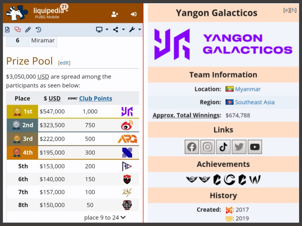 ကမ္ဘာလုံးဆိုင်ရာ PUBG အသင်း ၁၅ သင်းနဲ့ဩဂုတ် ၁ ရက်ကနေ ၃ ရက်အထိ သုံးရက်ကြာ ဗိုလ်လုရတဲ့ Grand Final ပြိုင်ပွဲမှာ Yangon Galacticos အသင်းဟာ အကောင်းဆုံးလက်စွမ်းပြသနိုင်ခဲ့ပြီး ကမ္ဘာ့အဆင့် ၁ ချန်ပီယံဆု နေရာကို ထိုက်ထိုက်တန်တန်ဆွတ်ခူးခဲ့တာကြောင့် ကမ္ဘာ့ချန်ပီယံအဖြစ် ဒေါ်လာ ၅၄၇၀၀၀ တိတိ ဆွတ်ခူးနိုင်ခဲ့တယ်လို့လည်း Liquipedia က ဖော်ပြထားပါတယ်။