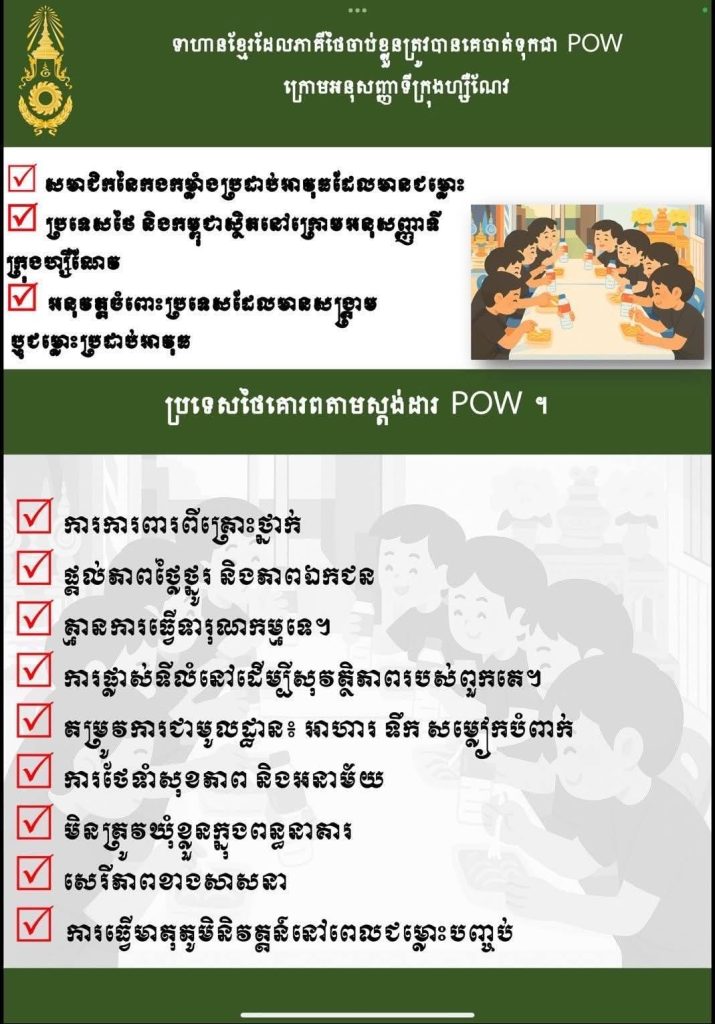 ဒါပေမဲ့ ထိုင်းနိုင်ငံ အများပြည်သူဆက်ဆံရေးဌာနကတော့ “ထိုင်းနိုင်ငံက ဖမ်းဆီးထားတဲ့ ကမ္ဘောဒီးယားစစ်သားတွေကို ဂျီနီဗာကွန်ဗင်းရှင်းအရ စစ်သုံ့ပန်း (Prisoner of War- POWs) အဖြစ် သတ်မှတ်ပါတယ်။ ဒီလိုသတ်မှတ်ခြင်းဟာ အပြစ်ပေးအရေးယူဖို့မဟုတ်ဘဲ နိုင်ငံတကာဥပဒေအရ သူတို့ရဲ့ အကာအကွယ်ခံပိုင်ခွင့်ကို ထူထောင်ဖို့သာ ဖြစ်ပါတယ်။ ထိုင်းနိုင်ငံဟာ နိုင်ငံတကာ စစ်သုံ့ပန်းများ စောင့်ရှောက်ရေးစံနှုန်းတွေကို လိုက်နာပြီး ဖမ်းဆီးခံထားရသူတွေဟာ လိုအပ်တဲ့ စစ်ဆေးမှုနဲ့ ကျန်းမာရေးစောင့်ရှောက်မှု၊ လုံလောက်တဲ့ အစားအစာ၊ သန့်ရှင်းတဲ့ သောက်သုံးရေနဲ့ သင့်လျော်တဲ့ အဝတ်အစားတွေ ရရှိစေဖို့ သေချာစေပါတယ်။ ထိုင်းနိုင်ငံဟာ ကျန်းမာရေးမကောင်းတဲ့ ကမ္ဘောဒီးယားစစ်သား နှစ်ဦးကို လိုအပ်တဲ့ ဆေးကုသမှုတွေ ပေးပြီးနောက် ပြန်လည်ပို့ဆောင်ပေးခဲ့ပြီး ဖြစ်ပါတယ်။ လက်ရှိအချိန်မှာ လက်နက်ချခဲ့တဲ့ ကမ္ဘောဒီးယားစစ်သား ၁၈ ဦးကို ထိန်းသိမ်းထားဆဲဖြစ်ပြီး လက်နက်ကိုင်ပဋိပက္ခ ပြီးဆုံးသွားတဲ့အခါမှာ လွှတ်ပေးပြီး မိခင်နိုင်ငံကို ပြန်ပို့ပေးသွားမှာ ဖြစ်ပါတယ်။”လို့ ဖော်ပြခဲ့တာ တွေ့ရပါတယ်။