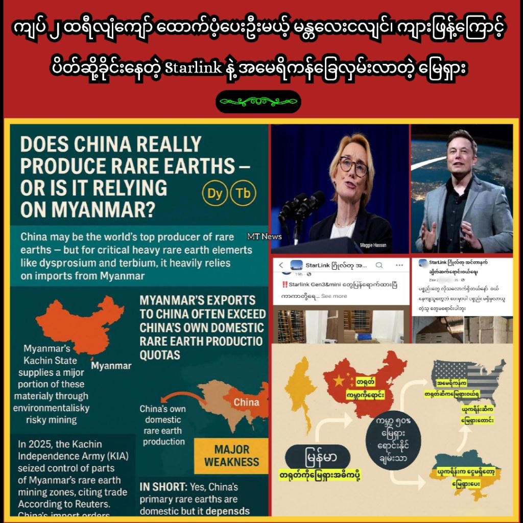 အခြားတစ်ဖက်မှာလည်း ပြီးခဲ့တဲ့ ဇူလိုင်လမှာ မြန်မာ့ကုန်ထုတ်လုပ်မှု PMI အညွှန်းကိန်း အနည်းငယ်မြင့်တက်ခဲ့တဲ့အပြင် ငလျင်နောက်ပိုင်း ပြန်လည် နာလန်ထမှုကလည်း ဆက်လက်တည်ရှိနေတယ်လို့ ဂျပန်နစ်ကေးရဲ့ လစဥ်စစ်တမ်းက ဖော်ပြခဲ့တာ၊ ရုရှားနိုင်ငံကို သရက်သီးအနှစ်နဲ့ သရက်သီးခြောက်တွေကို လုပ်ငန်းရှင်တွေနဲ့ တိုက်ရိုက်ချိတ်ဆက် တင်ပို့နိုင်ရေးနဲ့ အရည်အသွေးမြင့်ကော်ဖီတွေ တင်ပို့နိုင်ရေးကိုပါ ဆောင်ရွက်သွားမယ်ဆိုတာ၊ လာမယ့် နွေရာသီအမီ ဖြစ်နိုင်ခြေရှိတဲ့ ရှိပြီးသားစီမံကိန်းတွေကနေ ဓာတ်အားထုတ်လုပ်နိုင်ရေး စီမံဆောင်ရွက်နေပြီး မင်းဘူး ဆိုလာဓာတ်အားပေးစက်ရုံ ဒုတိယအဆင့် ၄၀ မဂ္ဂါဝပ် ထုတ်လုပ်နိုင်ရေးကို ၂၀၂၆ ခုနှစ် တတိယသုံးလပတ်ထက်စောပြီး ဓာတ်အားထုတ်လုပ်နိုင်ရေး ဆောင်ရွက်သွားဖို့ မှာကြားလာတာတွေ အပြင် နိုင်ငံအတွင်းကို တရားမဝင်ကုန်ပစ္စည်းဝင်ရောက်မှု လုံးဝ ကင်းစင်တဲ့အထိ ဆောင်ရွက်မှာဖြစ်ပြီး ပါဝင်ပတ်သက်နေသူ သစ္စာမဲ့ဝန်ထမ်းတွေကို ဖော်ထုတ်အရေးယူဖို့ SAC ဒုတိယဥက္ကဋ္ဌ ထပ်ပြောလာတဲ့ဖြစ်စဥ်တွေ ကြားမြင်ရပေမယ့် ဒီတစ်ပတ်ရဲ့ စီးပွားရေးသုံးသပ်ချက်အဖြစ် ငလျင်ကြောင့် နေအိမ်တိုက်တာအိုးအိမ်ပျက်စီးမှုတွေ ပြန်လည်ထူထောင်ရေးနဲ့ တည်ဆောက်ရေးအတွက် နောက်ထပ် ကျပ် ၂ ထရီလျံ ဆက်လက်ထောက်ပံ့ပေးနေတယ်လို့ SAC ဥက္ကဋ္ဌ ပြောကြားတဲ့အကြောင်း၊မြန်မာနိုင်ငံအပါအဝင် အရှေ့တောင်အာရှက အွန်လိုင်းလိမ်လည်မှုလုပ်ငန်းတွေမှာ အသုံးပြုနေတဲ့ Starlink ဂြိုဟ်တုအင်တာနက်အသုံးပြုခွင့် ပိတ်ပစ်ဖို့ အမေရိကန်အထက်လွှတ်တော်အမတ်က ဘီလျံနာ အီလွန်မာ့စ်ခ်ကို တိုက်တွန်းတဲ့အကြောင်းနဲ့ မြန်မာနိုင်ငံရဲ့ မြေရှားသတ္တုသိုက်တွေကို စိတ်ဝင်စားမှုနဲ့အတူ အမေရိကန်ရဲ့ မြန်မာနိုင်ငံအပေါ် မူဝါဒတွေပြောင်းလဲဖို့ အစပျိုးနေပြီလားလို့ ယူဆစရာအကြောင်းတွေကို သုံးသပ်ချင်ပါတယ်။