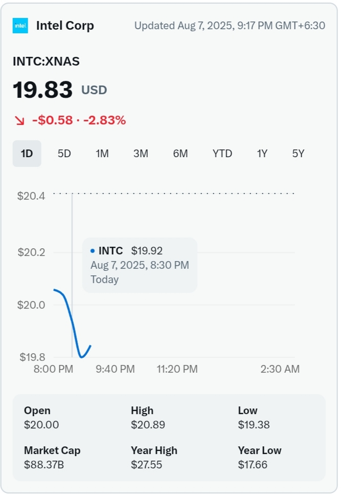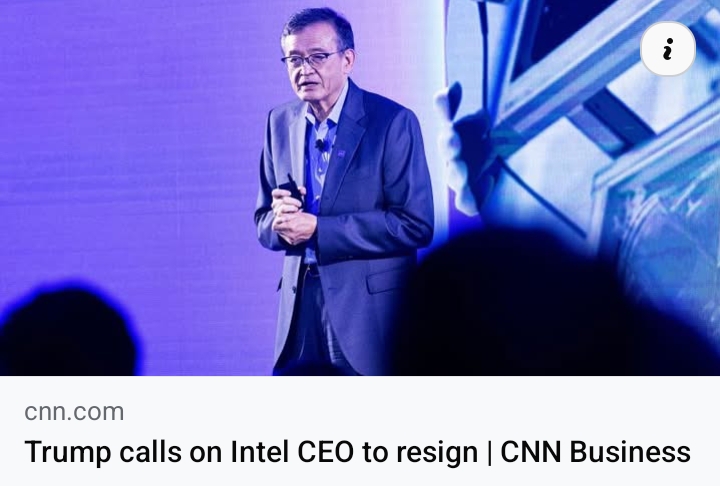 အမေရိကန်သမ္မတ ဒေါ်နယ်ထရမ့်ပ်က ချစ်ပ်ထုတ်လုပ်သည့်ကုမ္ပဏီ Intel ၏ CEO သည် ရာထူးမှ နုတ်ထွက်သင့်ကြောင်း လူမှုကွန်ရက်တွင် ရေးသားပြီးနောက် ကြာသပတေးနေ့တွင် Intel ၏ ရှယ်ယာတန်ဖိုးများ ကျဆင်းခဲ့သည်။