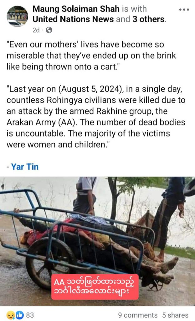 ရခိုင်ပြည်နယ်နှင့် ချင်းပြည်နယ်တွင် စစ်ရာဇဝတ်မှုကျူးလွန်နေသော ရခိုင်လက်နက်ကိုင် AA က ထန်းရှောက်ခံရွာမှ ဘင်္ဂါလီ ၆၀၀ ကျော်ကို အစုလိုက်အပြုံလိုက် လူမျိုးတုံးသတ်ဖြတ်လိုက်မှုကို ICC နှင့် နိုင်ငံတကာက စုံစမ်းစစ်ဆေးအရေးယူပေးရန် ARNC က တောင်းဆိုအပြီးတွင် ရခိုင်လက်နက်ကိုင် AA အဖွဲ့က ယင်းတို့၏ ဆိုးယုတ်လှသော စစ်ရာဇဝတ်မှုကို တပ်မတော်က ကျူးလွန်သည်ဟု လွှဲချရန် ကြံစည်နေကြောင်း ARNC ပူးတွဲဥက္ကဋ္ဌ ရိုနေဆန်းလွင်က ဖော်ထုတ်လိုက်သည်။