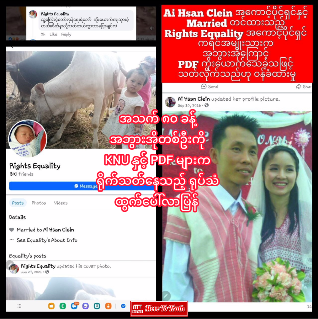 ထို့အတူ Ai Hsan Clein အကောင့်ပိုင်ရှင်နှင့် Married တင်ထားသည့် Rights Equality အကောင့်ပိုင်ရှင် ကရင်လက်နက်ကိုင်အမျိုးသားက အဘွားအိုကြောင့် PDF ကိုးယောက်သေခဲ့သဖြင့် သတ်လိုက်သည်ဟု ဝန်ခံထားမှုကို အဆိုပါ ပျံ့နှံ့နေသော ရုပ်သံ၏ မှတ်ချက်များထဲ တွေ့ရသည်။