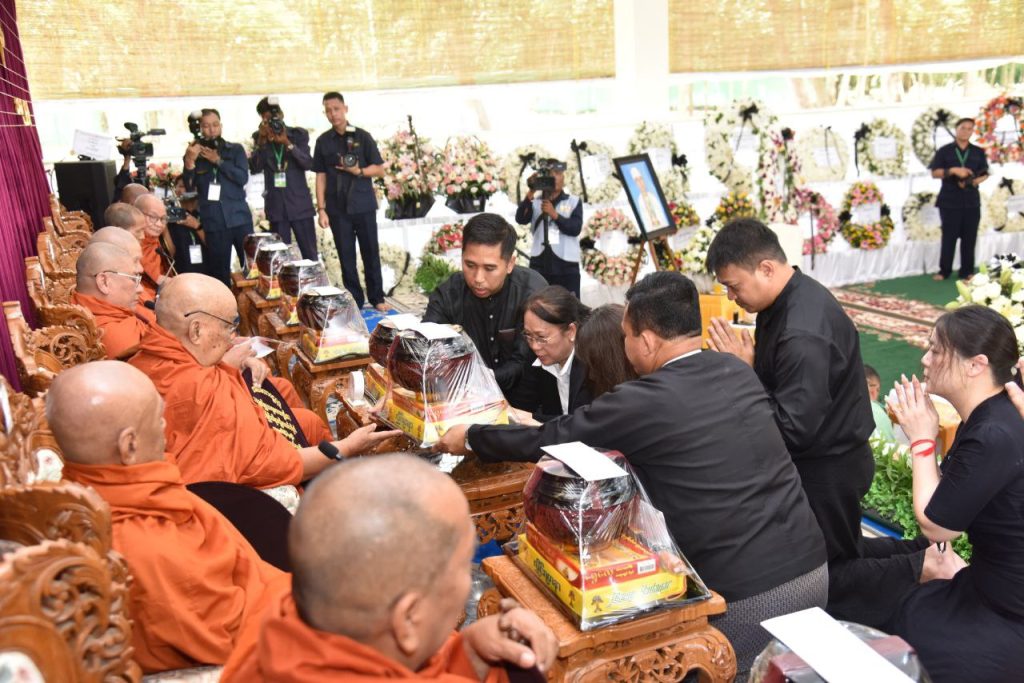 ထို့နောက် တပ်မတော်ကာကွယ်ရေးဦးစီးချုပ်နှင့် ဇနီး၊ နိုင်ငံတော်ဈာပနအခမ်းအနားသို့ တက် ရောက်လာကြသူများသည် နိုင်ငံတော်သံဃ မဟာနာယကအဖွဲ့ အကျိုးတော်ဆောင် မစိုးရိမ်တိုက်သစ်ဆရာတော်ထံမှ ငါးပါးသီလခံယူဆောက်တည်ကြပြီး သံဃာတော်အရှင်သူမြတ်များ ရွတ်ဆိုပွားများချီးမြှင့်တော်မူကြသည့် “သဗ္ဗေ သင်္ခါရာ အနိစ္စာတိ” အစချီသည့် သံဝေဂသုံး ဂါထာကို နာယူကြပြီးနောက် ယာယီသမ္မတ ဦးမြင့်ဆွေ၏ဇနီး ဒေါ်ခင်သက်ဌေးနှင့် မိသားစုများသည် ကြွရောက်တော်မူကြသည့် သံဃာတော်အရှင်သူမြတ်များအား သင်္ကန်းအစရှိသော လှူဖွယ်ပစ္စည်းများကို ဆက်ကပ်လှူဒါန်းကြကြသည်။