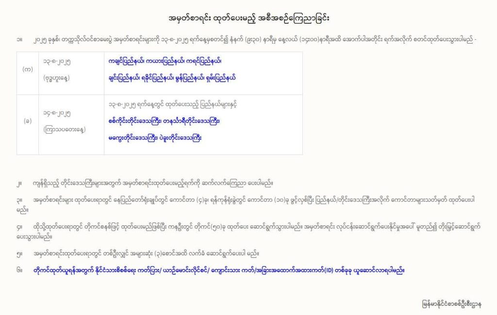 မနက်ဖြန် ဩဂုတ် ၁၃ ရက်နေ့တွင် ပြည်နယ်များ၏ အမှတ်စာရင်းများ စတင်ထုတ်ပေးမည်ဖြစ်သော်လည်း အခြား တိုင်းဒေသကြီးများမှ အမှတ်စာရင်းများ မထုတ်ပေးသေးဘဲ ဩဂုတ် ၁၄ ရက်နေ့တွင် ပြည်နယ်များနှင့် စစ်ကိုင်း၊ တနင်္သာရီ၊ မကွေး၊ ပဲခူး တိုင်းဒေသကြီးများ၏ အမှတ်စာရင်းများ စတင်ထုတ်ပေးမည်ဖြစ်ကာ အခြား တိုင်းဒေသကြီးများမှ အမှတ်စာရင်းများ မထုတ်ပေးသေးဘဲ ကျန်သည့် တိုင်းဒေသကြီးများ၏ အမှတ်စာရင်းထုတ်ပေးသည့်ရက်ကို ဆက်လက်ကြေညာပေးမည်ဖြစ်သည်။