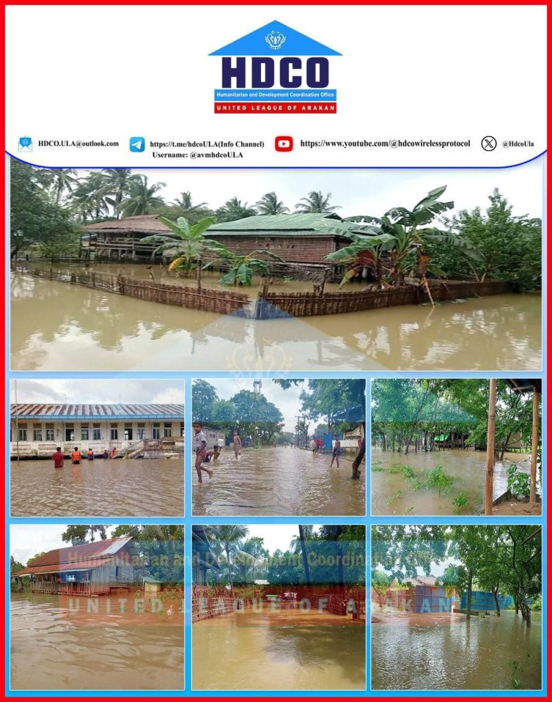 AA လက်အောက်ခံ HDCO (လူသားချင်းစာနာထောက်ထားရေးနှင့် ဖွံ့ဖြိုးရေးဆိုင်ရာပူးပေါင်းဆောင်ရွက်ရေးရုံး) အဆိုအရ ရခိုင်ပြည်နယ်အတွင်း ၂၀၂၅ ခုနှစ်၊ ဇွန်လကနေ ဇူလိုင်လအထိ မိုးများစွာရွာသွန်းမှုကြောင့် ရေကြီး၊ ရေလျှံမှုများစွာဖြစ်ပွားလို့ တောင်ကုတ်၊ ကျောက်တော်၊ ပုဏ္ဏားကျွန်း၊ မြောက်ဦး၊ မင်းပြား၊ ဘူးသီးတောင်၊ မောင်တောနဲ့ ရသေ့တောင်က ကျေးရွာ (၁၆၅) ရွာမှာ နေအိမ်တွေပျက်စီးခြင်း၊ စပါးခြင်းတွေပျက်စီးခြင်း၊ ရေတွင်း၊ ရေကန်တွေပျက်စီးခြင်းနဲ့ လမ်း၊ တံတားတွေပျက်စီးခြင်းအပြင် ရခိုင်ပြည်သူတွေလည်း အသက်ဆုံးရှုံးခဲ့ရတယ်ဆိုပါတယ်။