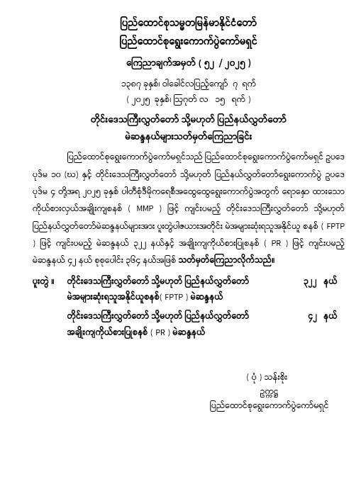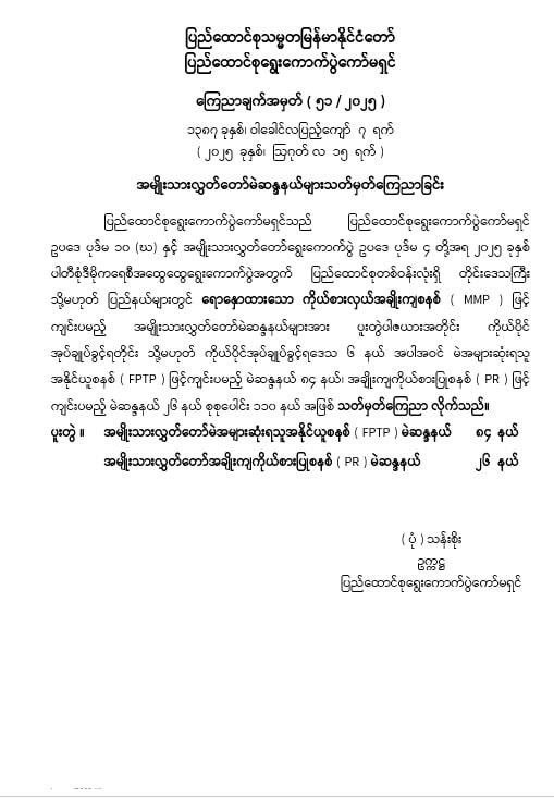 ၂၀၂၅ ခုနှစ် ပါတီစုံဒီမိုကရေစီအထွေထွေရွေးကောက်ပွဲအား FPTP ဖြင့် ကျင်းပမည့် ပြည်သူ့လွှတ်တော်မဲဆန္ဒနယ်မြေ ၃၃၀ ခု၊ FPTP နှင့် PR စနစ်နှစ်မျိုးဖြင့် ကျင်းပမည့် အမျိုးသားလွှတ်တော်မဲဆန္ဒနယ်မြေ ၁၁၀ ခု၊ MMP ဖြင့် ကျင်းပမည့် တိုင်းနှင့်ပြည်နယ် လွှတ်တော်မဲဆန္ဒနယ်မြေ ၃၆၄ ခုနှင့် တိုင်းနှင့်ပြည်နယ်လွှတ်တော် တိုင်းရင်းသားလူမျိုး မဲဆန္ဒနယ် ၂၉ ခုတို့ဖြင့် ဆောင်ရွက်သွားမည်ဖြစ်ကြောင်း ပြည်ထောင်စုရွေးကောက်ပွဲကော်မရှင်က ယနေ့တွင် ထုတ်ပြန်ကြေညာထားသည်။