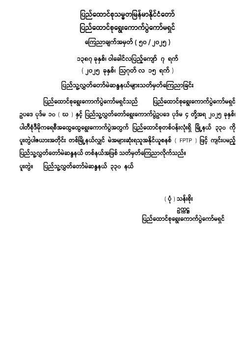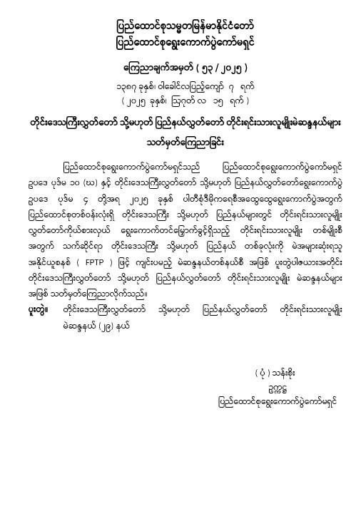 ယင်းမဲဆန္ဒနယ်မြေ သတ်မှတ်ထုတ်ပြန်ချက်များနှင့် လွှတ်တော်အလိုက် မဲဆန္ဒနယ်တွင် ပါဝင်သည့်နယ်မြေများစာရင်းအသေးစိတ်ကို နေ့စဉ်ထုတ်သတင်းစာများတွင် ထည့်သွင်းဖော်ပြပေး သွားမည်ဖြစ်ပြီး ပြည်ထောင်စုရွေးကောက်ပွဲကော်မရှင်ရုံး Website ဖြစ်သည့် www.uec.gov.mm တွင် ဝင်ရောက်ကြည့်ရှုနိုင်ကြောင်း အသိပေးထားသည်။
