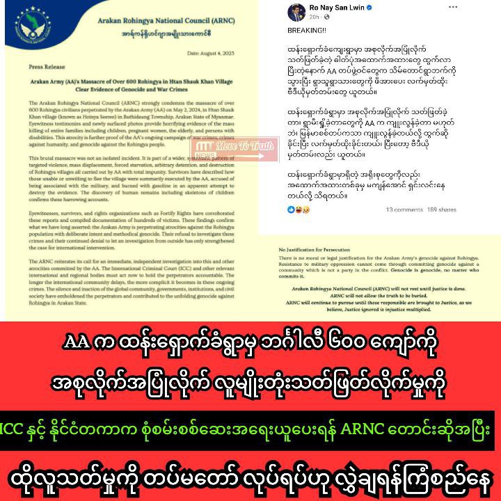 ◾ AA က ထန်းရှောက်ခံရွာမှ ဘင်္ဂါလီ ၆၀၀ ကျော်ကို သတ်ဖြတ်မှုအပြင် စစ်ဘေးရှောင်ရန် နတ်မြစ်ဘေး လှေစောင့်နေသည့် ဘင်္ဂါလီ ၂၀၀ ကျော်ကိုပါ သတ်ဖြတ်ခဲ့