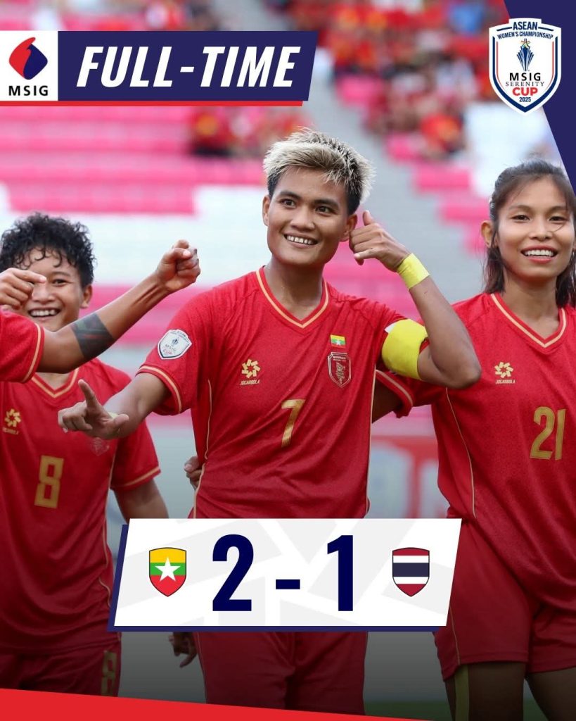 ဗီယက်နမ်နိုင်ငံတွင် ကျင်းပလျက်ရှိသည့်၂၀၂၅ အာဆီယံ အမျိုးသမီး ချန်ပီယံရှစ် ဆီမီးဖိုင်နယ်ပွဲစဉ် ပထမပွဲဖြစ်သည့် မြန်မာနှင့် ထိုင်းအသင်းတို့၏ ပွဲစဉ်ကို ယနေ့နေ့လယ်က ယှဥ်ပြိုင်ခဲ့ရာ မြန်မာအမျိုးသမီးအသင်းက ထိုင်းအသင်းကို အနိုင်ယူပြီး ဗိုလ်လုပွဲသို့ တက်လှမ်းနိုင်ခဲ့သည်။
