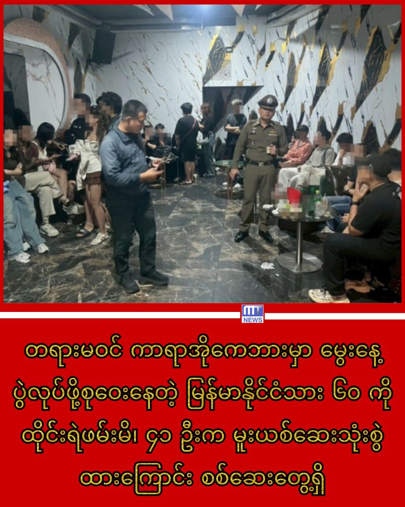 ထိုင်းနိုင်ငံ၊ ဘန်ကောက်က တရားမဝင် ကာရာအိုကေဘားတစ်ခုကို ထိုင်းရဲတပ်ဖွဲ့က ဝင်ရောက်စီးနင်းခဲ့ရာမှာ မွေးနေ့ပွဲကျင်းပဖို့ စုဝေးနေကြတဲ့ မြန်မာနိုင်ငံသားတွေကို ဖမ်းမိခဲ့ပြီး အဲဒီအထဲက မြန်မာနိုင်ငံသား ၄၁ ဦးဟာ မူးယစ်ဆေးဝါး သုံးစွဲထားတာကို တွေ့ရှိခဲ့ပါတယ်။