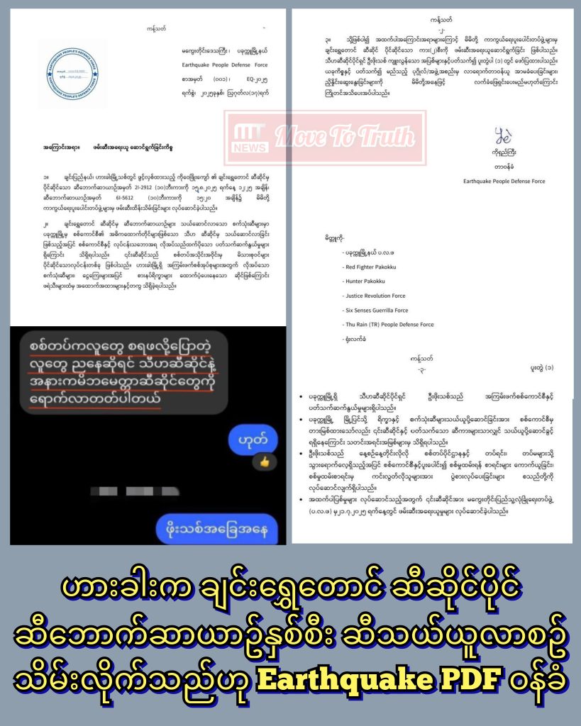 ဟားခါးမြို့မှ ချင်းရွှေတောင် ဆီဆိုင်ပိုင် ဆီဘောက်ဆာ ဆယ်ဘီးယာဥ်နှစ်စီး ဆီထည့်ကာသယ်ယူလာစဥ် သိမ်းယူလိုက်သည့်ဟု Earthquake PDF အဖွဲ့က ယနေ့ ဝန်ခံလာသည်။