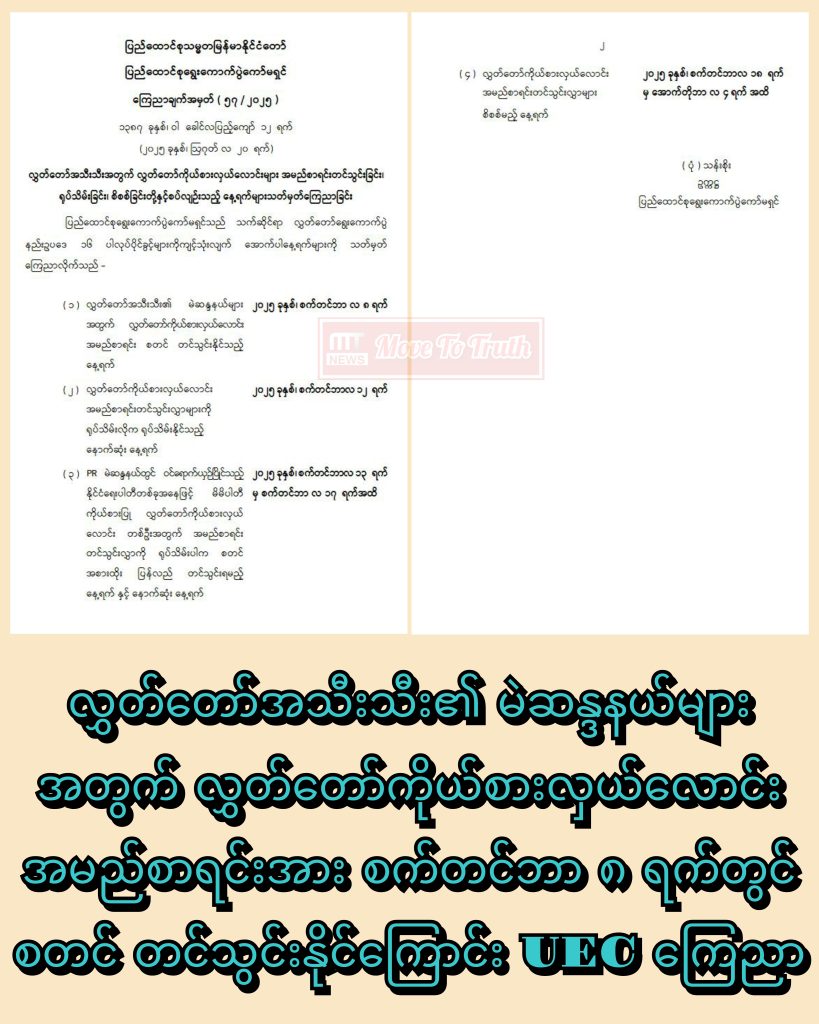 လွှတ်တော်အသီးသီးအတွက် လွှတ်တော်ကိုယ်စားလှယ်လောင်းများ အမည်စာရင်းတင်သွင်းခြင်း၊ ရုပ်သိမ်းခြင်း၊ စိစစ်ခြင်းတို့နှင့် စပ်လျဉ်းသည့် နေ့ရက်များ သတ်မှတ်ကြေညာခြင်းအား ပြည်ထောင်စုရွေးကောက်ပွဲကော်မရှင် (UEC) က ကြေညာချက်အမှတ် (၅၇ / ၂၀၂၅) ဖြင့် ယနေ့တွင် အသိပေးထုတ်ပြန်ထားသည်။