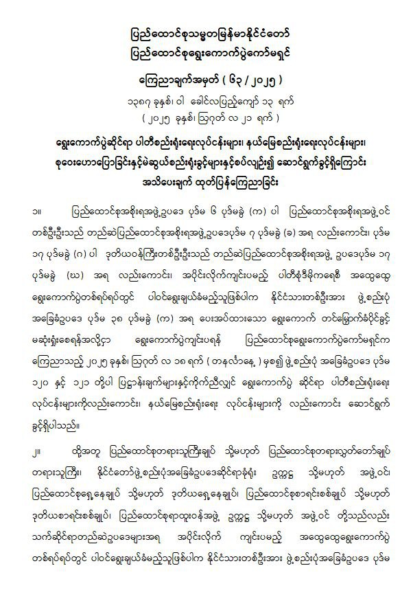 ပြည်ထောင်စုအစိုးရအဖွဲ့ဝင်များနှင့် ပြည်ထောင်စုအဆင့်အဖွဲ့အစည်းများမှ ပုဂ္ဂိုလ်များအနေဖြင့် ဖွဲ့စည်းပုံအခြေခံဥပဒေ ပုဒ်မ ၁၂၀ နှင့် ၁၂၁ တို့ပါ ပြဋ္ဌာန်းချက်များနှင့်ကိုက်ညီလျှင် ရွေးကောက်ပွဲဆိုင်ရာ ပါတီစည်းရုံးရေးလုပ်ငန်းနှင့် နယ်မြေစည်းရုံးရေးလုပ်ငန်းများကို ဆောင်ရွက်ခွင့်ရှိကြောင်း ပြည်ထောင်စုရွေးကောက်ပွဲကော်မရှင် (UEC) က ကြေညာချက်အမှတ် (၆၃/၂၀၂၅) ဖြင့် ယနေ့တွင် အသိပေးကြေညာထားသည်။