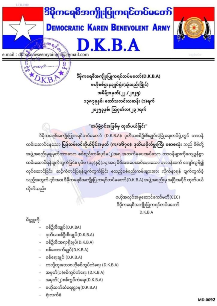 ကရင်ပြည်နယ်က လက်နက်ကိုင်တပ်ဖွဲ့အသီးသီးကို မကြာခဏဘက်ကူးပြောင်းနေသူ စောစလုံးကို DKBA က ဒီနေ့မှာ အပြီးအပိုင်ထုတ်ပယ်လိုက်ပြန်ပါတယ်။