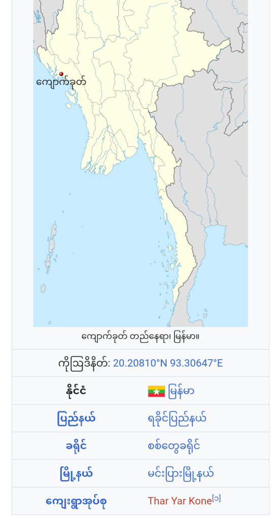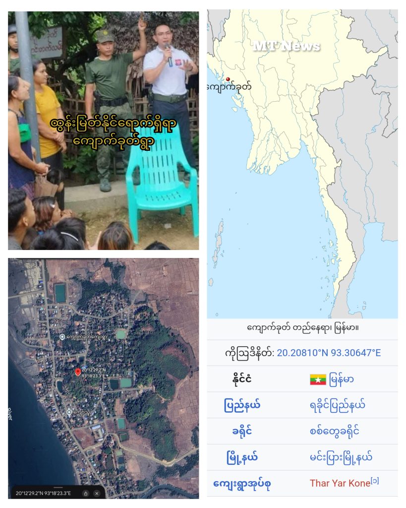 Lay Waddy FM က ဖော်ပြခဲ့တဲ့ ထွန်းမြတ်နိုင်တွေ့သူရခိုင်ပြည်သူလူထုဆိုတာဟာ ကလေး အယောက် ၂၀ ဝန်းကျင်၊ လူငယ်အမျိုးသားတစ်ယောက်နဲ့ သက်ကြီးပိုင်းတွေပါတဲ့ အမျိုးသမီး အယောက် ၂၀ လောက်သာရှိသလို နောက်ခံပုံရိပ်မှာလည်း ကျောက်ခုတ်ဆိုတဲ့စာတန်းနဲ့ လမ်းနာမည်ပေါ်နေတာကြောင့် ထွန်းမြတ်နိုင်ရောက်နေတာဟာ စစ်တွေခရိုင်၊ မင်းပြားမြို့နယ်၊ သာယာကုန်းရွာအုပ်စုက ကျောက်ခုတ်ရွာ ဖြစ်နိုင်တယ်လို့ သုံးသပ်ကြပါတယ်။
