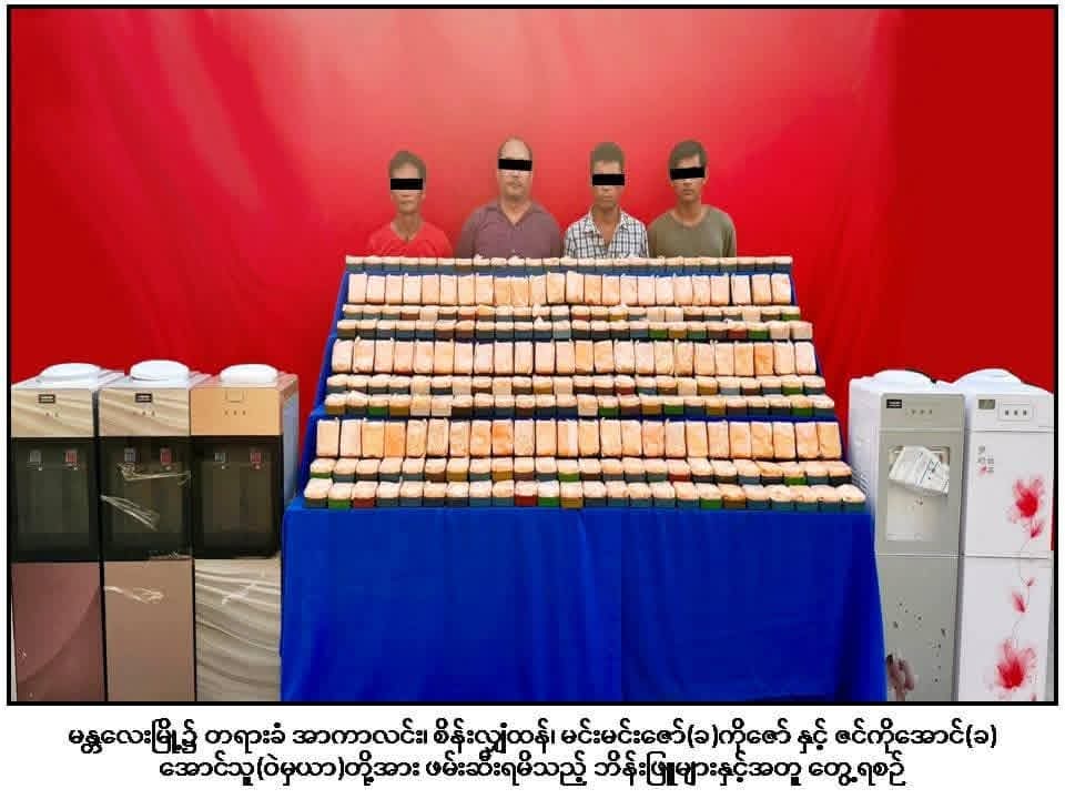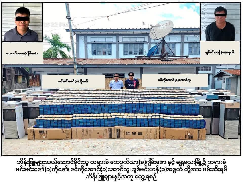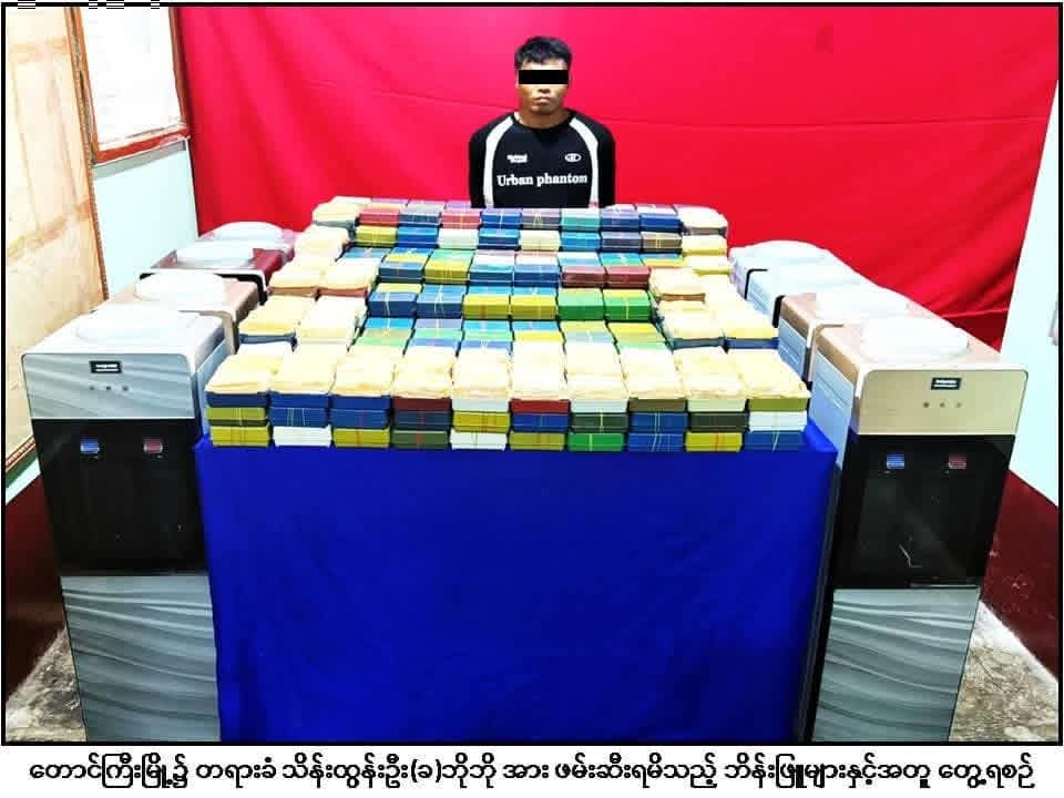 Water Cooler ထဲ မူးယစ်ဆေးများ ထည့်ကာရှမ်းပြည်နယ်(မြောက်ပိုင်း)၊ မိုင်းရယ်မြို့နယ်မှ စစ်ကိုင်းတိုင်းဒေသကြီး၊ ကလေးမြို့နယ်သို့ သယ်ဆောင်သည့် ငွေကျပ် ၁ ဒသမ ၇ ဘီလျံကျော်တန်ဖိုးရှိ ဘိန်းဖြူ ၅၆ ဒသမ ၃၆ ကီလို ဖမ်းဆီးရမိခဲ့ကြောင်း မူးယစ်ဆေးဝါးတားဆီးနှိမ်နင်းရေးရဲတပ်ဖွဲ့မှ သိရသည်။