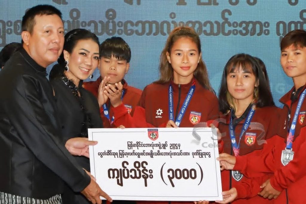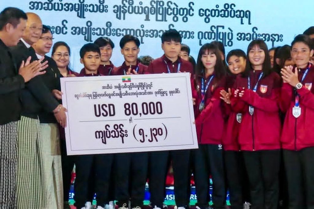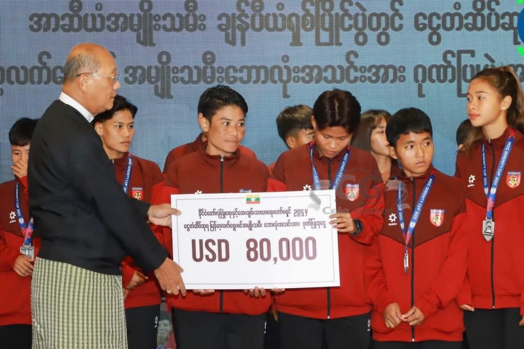 ၂၀၂၅ အာဆီယံ အမျိုးသမီး ချန်ပီယံရှစ်တွင် အစဥ်အလာ ခါးသီးပြိုင်ဘက် ထိုင်းအသင်းကို ၂ ဂိုး ၁ ဂိုးဖြင့် အနိုင်ယူကာ ဗိုလ်လုပွဲသို့ တက်ရောက်နိုင်ခဲ့သည့် မြန်မာ့လက်ရွေးစင် အမျိုးသမီးအသင်းအား ဗိုလ်ချုပ်မှူးကြီး မင်းအောင်လှိုင်က ဒေါ်လာ ၃၀,၀၀၀ ဂုဏ်ပြုချီးမြှင့်ခဲ့သေးသလို အကြိုဗိုလ်လုပွဲကို ကျော်ဖြတ်နိုင်၍လည်း ကျပ်သိန်း ၂၀၀၀ ဆုချီးမြှင့်မှုများ ရရှိထားသည်ဟု ဗိုလ်လုပွဲမတိုင်မီကလည်း ကြေညာခဲ့သေးသည်။