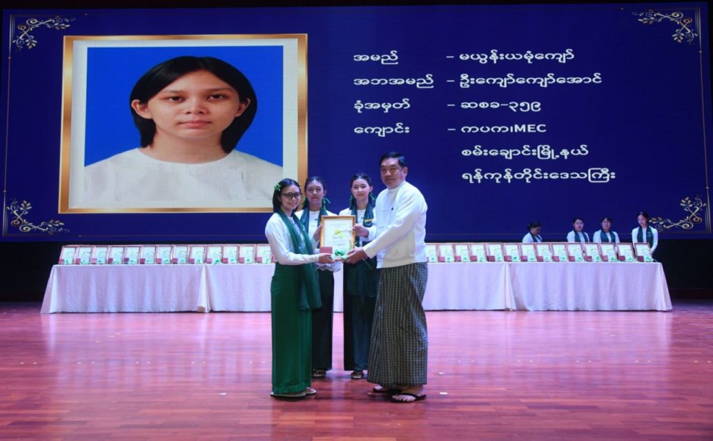 ဆက်လက်၍ နိုင်ငံတော်လုံခြုံရေးနှင့် အေးချမ်းသာယာရေးကော်မရှင် ဒုတိယဥက္ကဋ္ဌ ဒုတိယဗိုလ်ချုပ်မှူးကြီး စိုးဝင်းက သိပ္ပံဘာသာတွဲတွင် မြန်မာတစ်နိုင်ငံလုံး အမှတ်အများဆုံးရရှိသည့် ကျောင်းသား၊ ကျောင်းသူ ၁၃ ဦးအား တစ်ဦးချင်းဂုဏ်ပြုဆုများ ပေးအပ်ချီးမြှင့်သည်။