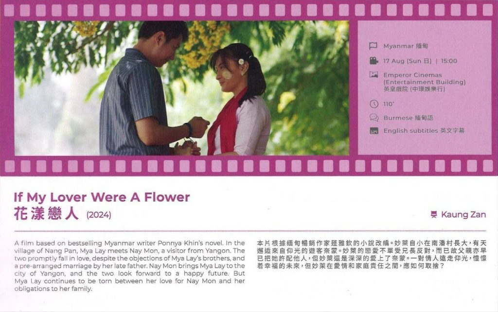 ဟောင်ကောင်အထူး အုပ်ချုပ်ရေးဒေသရှိ မြန်မာကောင်စစ်ဝန်ချုပ်ရုံးက ၂၀၂၅ ခုနှစ် အာဆီယံရုပ်ရှင်ပွဲတော်မှာ ပါဝင်ဆင်နွှဲခဲ့ပြီး ဩဂုတ် ၁၇ ရက် နေ့လယ် ၃ နာရီမှာ ဟောင်ကောင်ဒေသ၊ Central ရှိ Entertainment အဆောက်အအုံ၊ Emperor ရုပ်ရှင်ရုံမှာ “ချစ်သူသာပန်းတစ်ပွင့် ဖြစ်ခဲ့လျှင်” မြန်မာရုပ်ရှင်ဇာတ်ကားကို ပါဝင်ပြသခဲ့တယ်လို့ သိရပါတယ်။