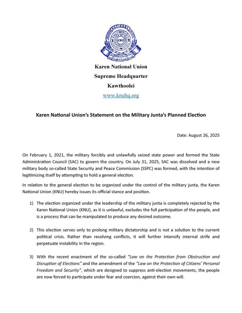 လက်နက်မဲ့ ဝန်ထမ်းပြည်သူများအား လိုက်လံ ချောင်းမြောင်းသတ်ဖြတ်နေသည့် PDF များကို မွေးထုတ်ခဲ့သော KNU က လာမည့်ရွေးကောက်ပွဲကို အကြမ်းမဖက်သောနည်းလမ်းဖြင့်သာ ဆန့်ကျင်ရန် ယနေ့ သတိပေးလိုက်သည်။