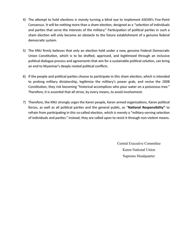 စကောကရင်၊ ပိုးကရင်၊ မြန်မာ၊ အင်္ဂလိပ်လေးဘာသာဖြင့် KNU (ကရင်အမျိုးသားအစည်းအရုံး) က ထုတ်ပြန်လာသည့် အဆိုပါကြေညာချက်တွင် ရွေးကောက်ပွဲလက်မခံကြောင်း အထူးပြုရေးသားထားသလို “စစ်တပ်ကို အကျိုးပြုမည့် လူနှင့်ပါတီ ရွေးချယ်ပွဲ”ဟု တံဆိပ်ကပ်ထားသော်လည်း ရွေးကောက်ပွဲကို အကြမ်းမဖက်သောနည်းလမ်းဖြင့်သာ ဆန့်ကျင်ရန်ကို “ကရင်အမျိုးပြည်သူလူထုများ၊ ကရင်လက်နက်ကိုင် အဖွဲ့အစည်း များ၊ ကရင်နိုင်ငံရေး အင်အားစုများ အပါအဝင် နိုင်ငံရေးပါတီများနှင့် ပြည်သူလူထုတရပ်လုံးက ပါဝင်ခြင်း မပြုကြဘဲ အကြမ်းမဖက်သော နည်းလမ်းများဖြင့် ဆန့်ကျင်သွားရန် တိုက်တွန်းအပ်ပါသည်။” အထူးပြုဖော်ပြထားသည်။