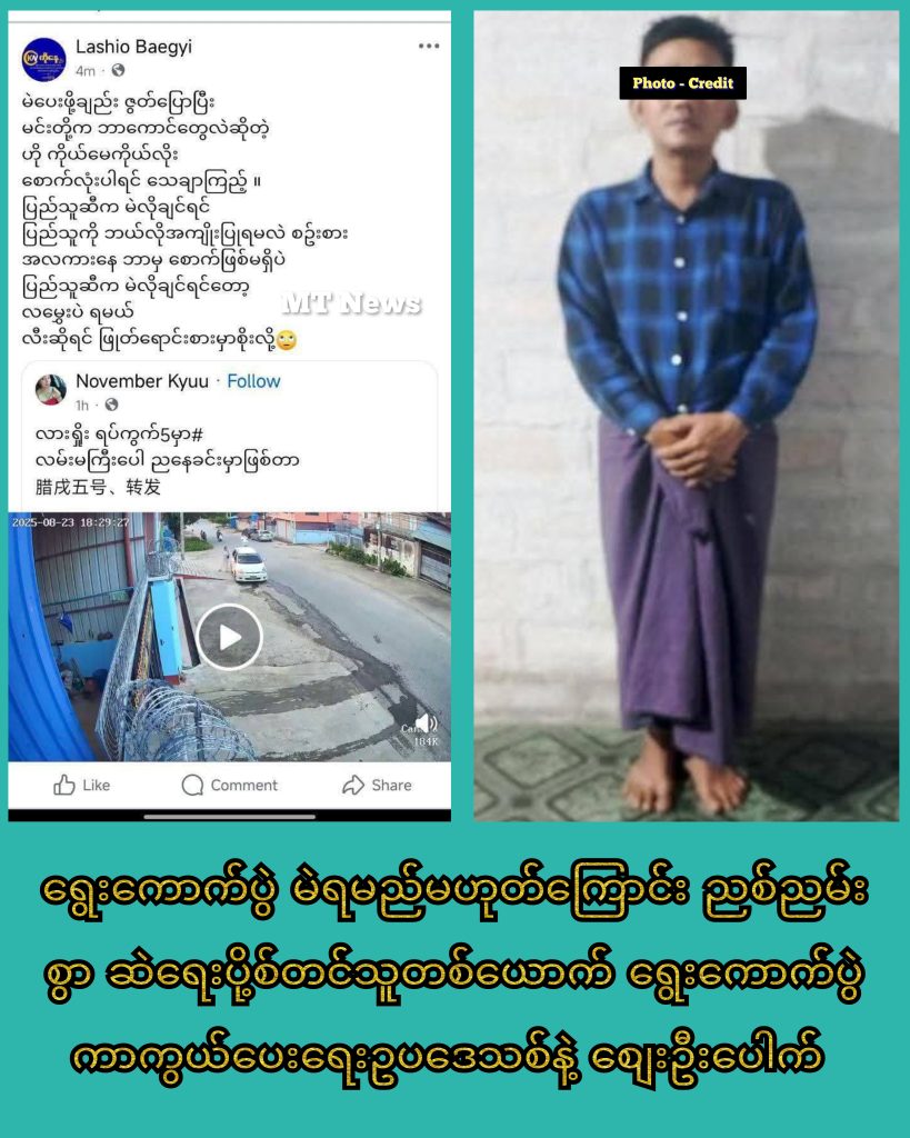 ဒါကြောင့်မို့လို့ “Lashio Baegyi” Facebook Account ကို တာဝန်ရှိသူတွေက ရှာဖွေစစ်ဆေးခဲ့ရာမှာ တောင်ကြီးမြို့၊ အေးသာယာမြို့သစ်၊ ရပ်ကွက်(၁)၊ အမှတ်(၄၄/၅၇)နေ နေသွေး ၃၆ နှစ်ကို တွေ့ရှိရပြီး သူကိုင်ဆောင်တဲ့ Xiaomi Civi-1 အမျိုးအစားဖုန်းကို ဆက်လက်စစ်ဆေးခဲ့ရာမှာ “Lashio Baegyi” Facebook Account ဖွင့်လှစ်ထားတာတွေ့ရတာကြောင့် ပါတီစုံဒီမိုကရေစီအထွေထွေ ရွေးကောက်ပွဲ ပျက်ပြားစေဖို့ လူမှုကွန်ရက်မှာ ရေးသားဖြန့်ဝေထားမှုအရ အေးသာယာနယ်မြေရဲစခန်းက ၂၀၂၅ ခုနှစ်၊ ပါတီစုံဒီမိုကရေစီအထွေထွေ ရွေးကောက်ပွဲများကို နှောင့်ယှက်ဟန့်တား ဖျက်ဆီးခြင်းမှ ကာကွယ်ပေးရေးဥပဒေ ပုဒ်မ – ၂၃(က) နဲ့ အရေးယူထားတာလို့ သိရပါတယ်။