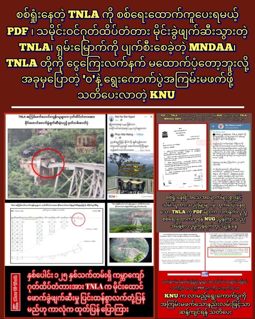 အခြားတစ်ဖက်မှာလည်း AA ကို ဆက်ကြေးပေးပြီး မလေးရှားကို မူးယစ်ဆေး မှောင်ခိုဖြန့်နေတဲ့ မူးယစ်ဂိုဏ်းကို ကျပ် ဘီလျံ ၂၆၀ နီးပါး တန်ဖိုးရှိ မူးယစ်ဆေးတွေနဲ့ စံချိန်တင် ဖမ်းမိလာတာ၊ ရခိုင်အကြမ်းဖက်လက်နက်ကိုင် AA စစ်ဦးစီးချုပ်ထွန်းမြတ်နိုင် သွားရောက်ခဲ့တဲ့ ကျောက်ခုတ်ရွာဗုံးကြဲခံရတာ၊ ၁၉ ကြိမ်မြောက် အာဆီယံရေတပ်ဦးစီးချုပ်အစည်းအဝေး တက်ရောက်ခဲ့တဲ့ ကာကွယ်ရေးဦးစီးချုပ် (ရေ) ဟာ မလေးရှား၊ ဗီယက်နမ်၊ ထိုင်း၊ ကမ္ဘောဒီးယား ရေတပ်ဦးစီးချုပ်တွေနဲ့ လာအို စစ်ဦးစီးဌာန ဒုတိယကြီးအကဲတွေကို သီးခြားတွေ့ဆုံပြီး ရေတပ်ဆိုင်ရာ ပူးပေါင်းဆောင်ရွက်နိုင်မှုတွေ ဆွေးနွေးခဲ့တာ စတာတွေအပြင် AA လက်နက်ကိုင်တွေ တပ်စွဲထားတဲ့ မြောက်ဦးက ဒိုင်းကျီရပ်ကွက်ကို တပ်မတော်က လေကြောင်းတိုက်ခိုက်ရာမှ AA လက်နက်ကိုင်အမျိုးသား အရွယ်ကောင်း ၁၂ ယောက် သေဆုံးသွားတာကို အရပ်သားတွေပါလို့ လိမ်လည်ထုတ်ပြန်တဲ့ဖြစ်စဉ်တွေ မြင်တွေ့ရပေမဲ့ ဒီတစ်ပတ်ရဲ့ နိုင်ငံရေးသုံးသပ်ချက်ကိုတော့ စစ်ရှုံးနေတဲ့ TNLA ကို စစ်ရေးထောက်ကူပေးရမယ်လို့ PDF တွေကို NUG ညွှန်ကြားလာတာ၊ သမိုင်းဝင်ဂုတ်ထိပ်တံတားကို TNLA က မိုင်းခွဲဖျက်ဆီးလိုက်တာ၊ ရှမ်းမြောက်ကို ပျက်စီးစေခဲ့တဲ့ TNLA၊ MNDAA တို့ကို ငွေကြေးလက်နက် မထောက်ပံ့တော့ဘူးလို့ ‘၀’လက်နက်ကိုင် UWSA ထုတ်ပြောလာတာနဲ့ ရွေးကောက်ပွဲအကြမ်းမဖက်ဖို့ KNU က သတိပေးလာတဲ့ အကြောင်းတွေကို သုံးသပ်ချင်ပါတယ်။