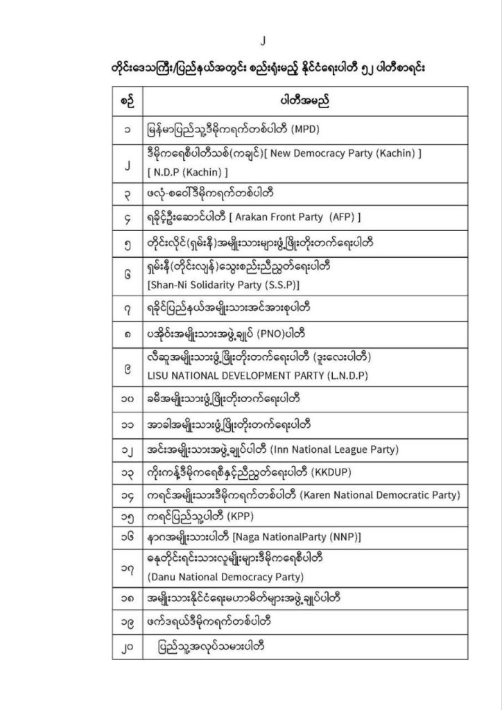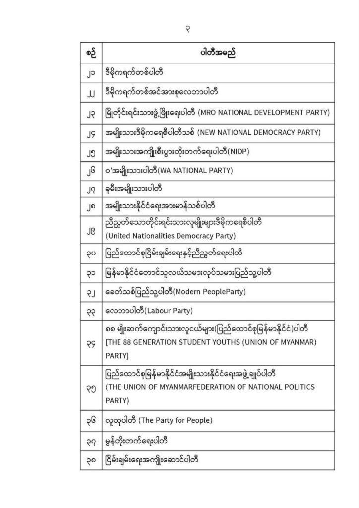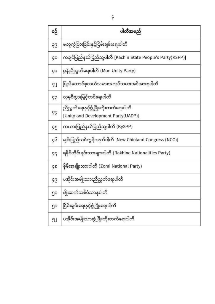 ထို့အပြင် ပြည်ထောင်စုရွေးကောက်ပွဲကော်မရှင်အနေဖြင့် တိုင်းဒေသကြီးနှင့် ပြည်နယ်အတွင်းသာ စည်းရုံးမည့် နိုင်ငံရေးပါတီ ၅၂ ပါတီစာရင်းကိုလည်း ပူးတွဲထုတ်ပြန်ပေးထားသည်။