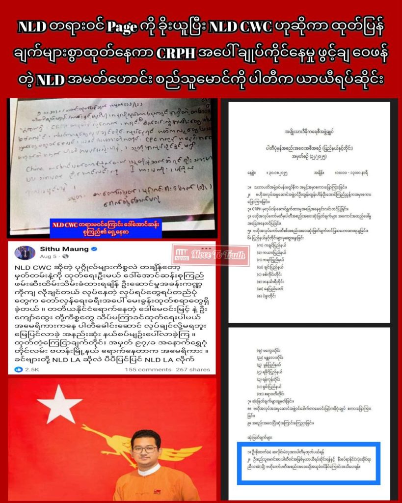 NLD ရဲ့ တရားဝင် Page ကို ပြည်ပပြေးတဲ့ NLD CEC ဦးအောင်ကြည်ညွန့်၊ ဒေါက်တာမေဝင်းမြင့်၊ ဦးကျော်ထွေး၊ ဦးဟန်သာမြင့်နဲ့ သမက် နေဘုန်းလတ်တို့က အပိုင်စီး ခိုးယူပြီး NLD CWC ဖွဲ့ကာ လူထုကို လိမ်ညာတဲ့ ထုတ်ပြန်ချက်တွေ တရားမဝင် ထုတ်နေမှုနဲ့ CRPH ကို ချုပ်ကိုင်မှုအပေါ် NLD CWC (NLD ဗဟိုအလုပ်ကော်မတီ) တရားဝင် မဝင် ဝေဖန်တဲ့ NLD အမတ်ဟောင်း စည်သူမောင်ကို NLD ပါတီကနေ ယာယီရပ်ဆိုင်းကြောင်း NLD ပါတီက ကြေညာထားတယ်လို့ ပန်းဘဲတန်းအမတ်ဟောင်း စည်သူမောင်က လူမှုကွန်ရက်မှာ ရေးသားလာတာ ဒီတစ်ပတ်မှာ တွေ့မြင်ရပါတယ်။
