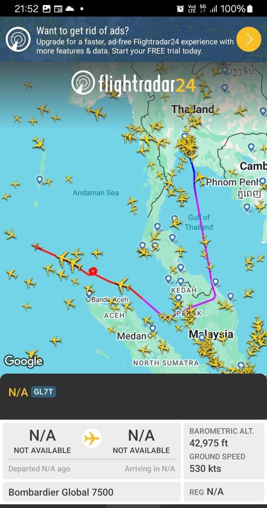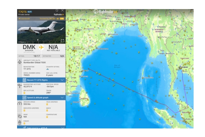 သက်ဆင် သို့မဟုတ် လေယာဉ်မှူးသည် လေယာဉ်ခရီးစဉ်အချက်အလက်များကို အများပြည်သူသုံး ခြေရာခံအပလီကေးရှင်းများတွင် မပေါ်စေရန် ပုဂ္ဂိုလ်ရေးဆိုင်ရာအစီအစဉ်များကို ဝယ်ယူ၍ တားဆီးထားနိုင်သလို သက်ဆင်၏ လေယာဉ်ကို ထပ်မံခြေရာခံနိုင်မှုအရ ဘန်ကောက်စံတော်ချိန် ည ၁၁ နာရီ ၅ မိနစ်တွင် ဘင်္ဂလားပင်လယ်အော်အနီးရှိ အိန္ဒိယနိုင်ငံ၊ ချန်နိုင်းမြို့အနီးတွင်ရှိနေကာ အနောက်မြောက်ဘက်သို့ ရွေ့လျားနေသည်။
