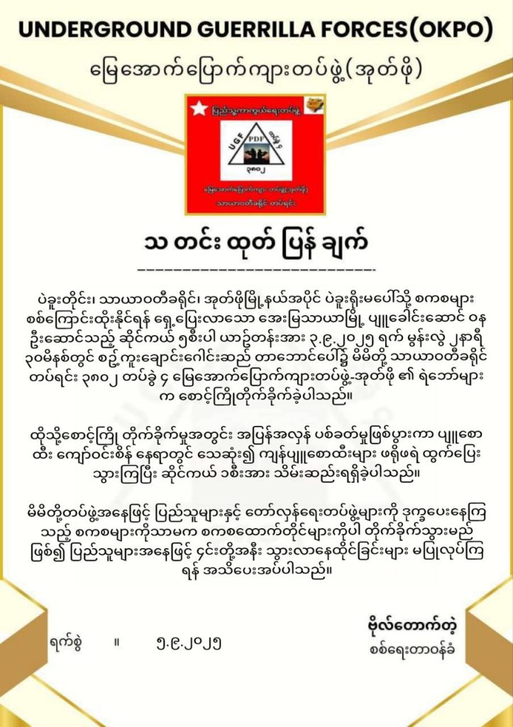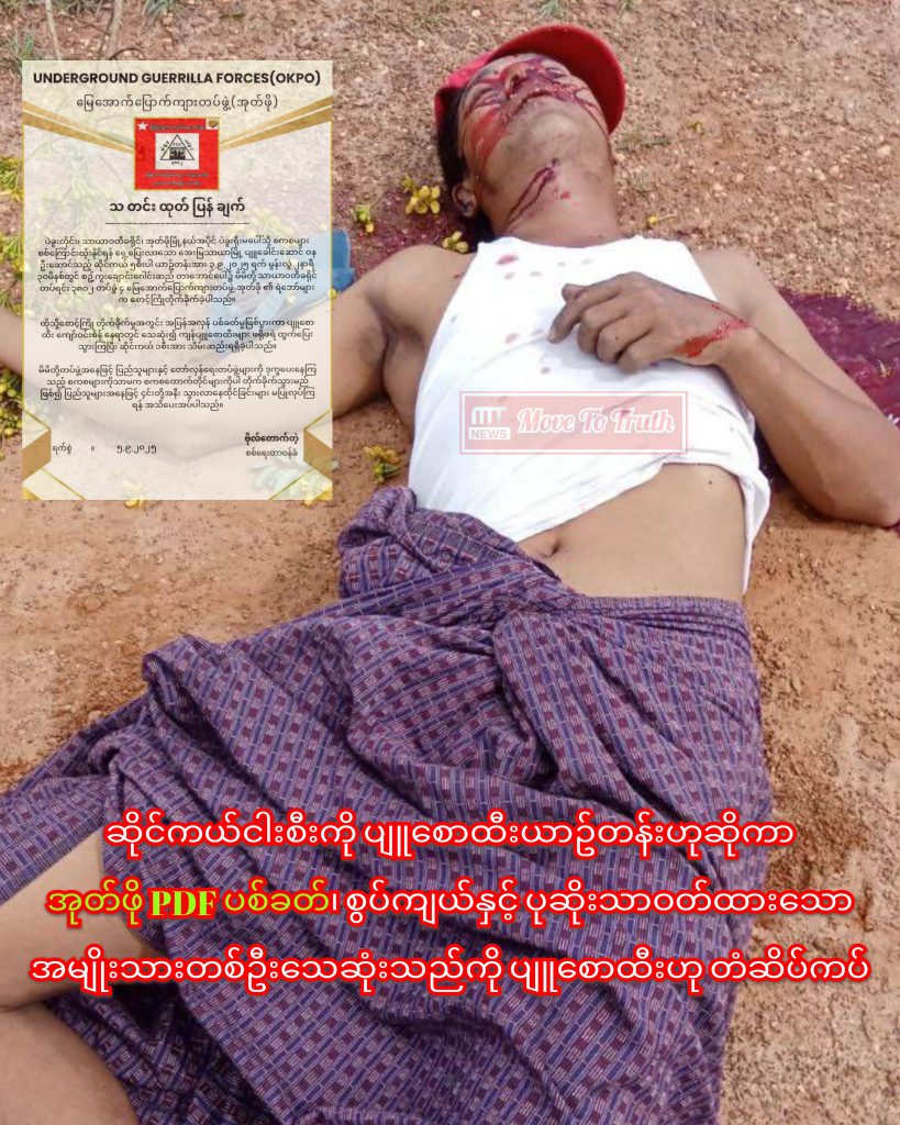 ပဲခူးတိုင်းဒေသကြီး၊ အုတ်ဖိုမြို့တွင် မောင်းနှင်လာသော ဆိုင်ကယ်ငါးစီးကို ပျူစောထီးယာဥ်တန်းဟုဆိုကာ အုတ်ဖိုက PDF ပစ်ခတ်သဖြင့် စွပ်ကျယ်နှင့် ပုဆိုးသာဝတ်ထားသော အမျိုးသားတစ်ဦးသေဆုံးသွားသည်ကို ပျူစောထီးတစ်ဦးသေဆုံးသည်ဟု အုတ်ဖို PDF က ယခု ထုတ်ပြန်ဝန်ခံသည်။