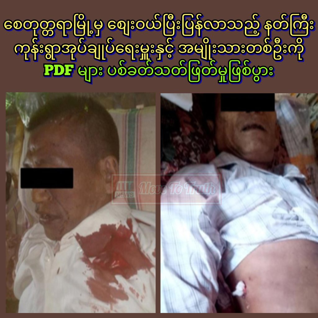 စေတုတ္တရာမြို့မှ စျေးဝယ်ပြီးပြန်လာသည့် နတ်ကြီးကုန်းရွာအုပ်ချုပ်ရေးမှူးနှင့် အမျိုးသားတစ်ဦးကို PDF များက စောင့်ကြို ပစ်ခတ်သတ်ဖြတ်မှုဖြစ်ပွားခဲ့သည်ဟု ပြည်ထဲရေးဝန်ကြီးဌာနက ယနေ့ထုတ်ပြန်သည်။