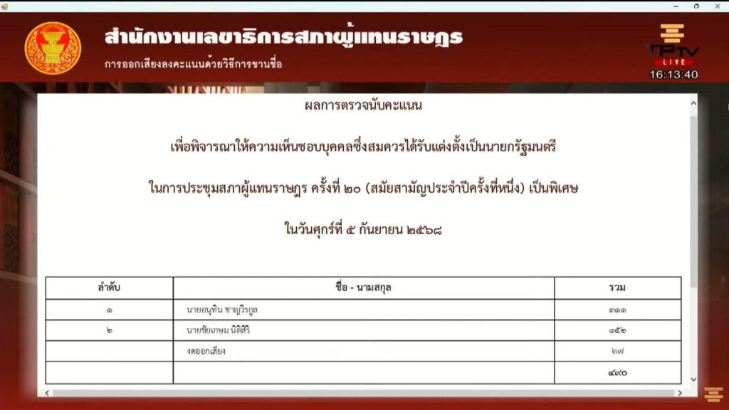 ဘွမ်ဂျေထိုင်းပါတီခေါင်းဆောင် အနျူတင်က ဝန်ကြီးချုပ်အဖြစ်ရွေးကောက်တင်မြှောက်ခံရနိုင်ဖို့ လိုအပ်တဲ့ထောက်ခံမဲထက် ကျော်လွန်ရရှိခဲ့တယ်လို့သိရပြီး စုစုပေါင်း ၃၁၁ မဲအထိ ရရှိခဲ့တာပါ။